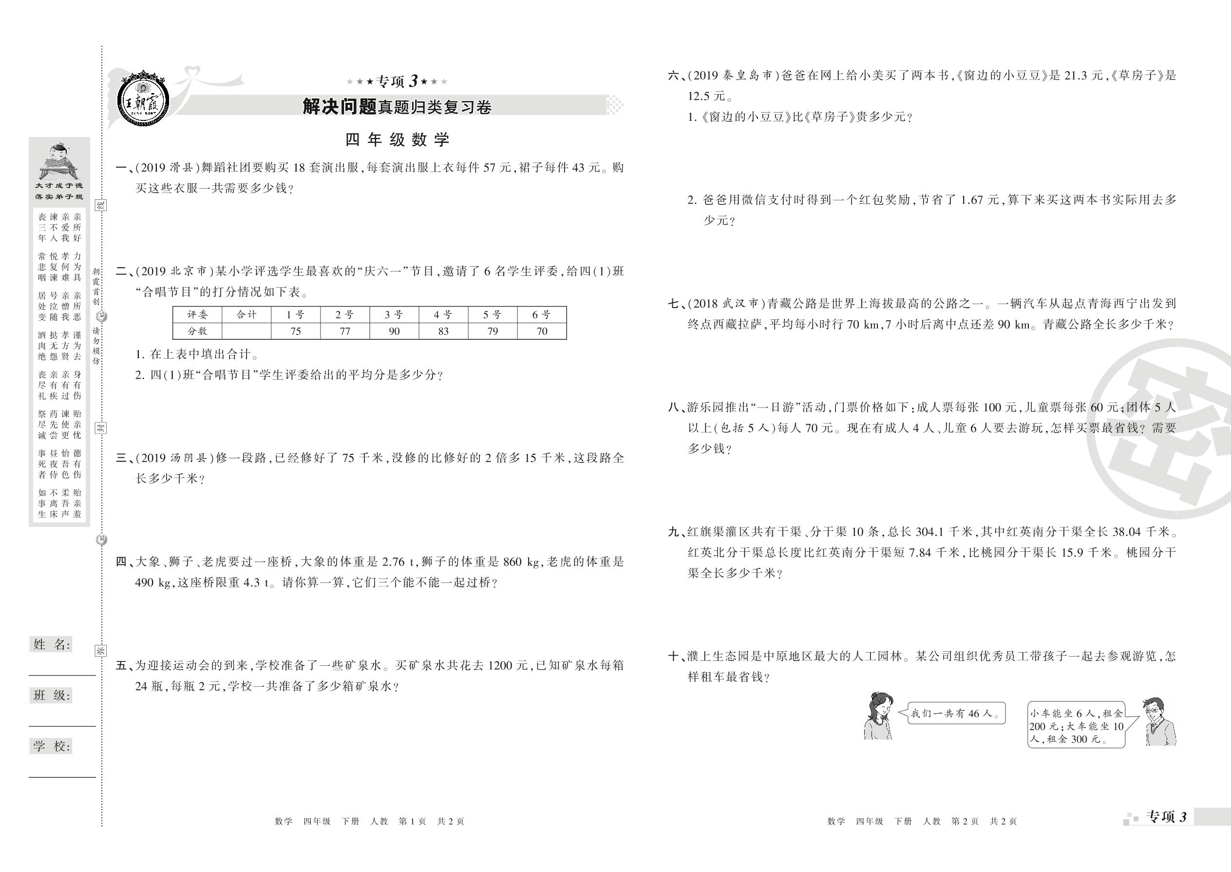 王朝霞期末专项卷——解决问题真题归类复习卷、新颖题速递:生活与数学四年级下册数学(人教版)_R210804142145【0】