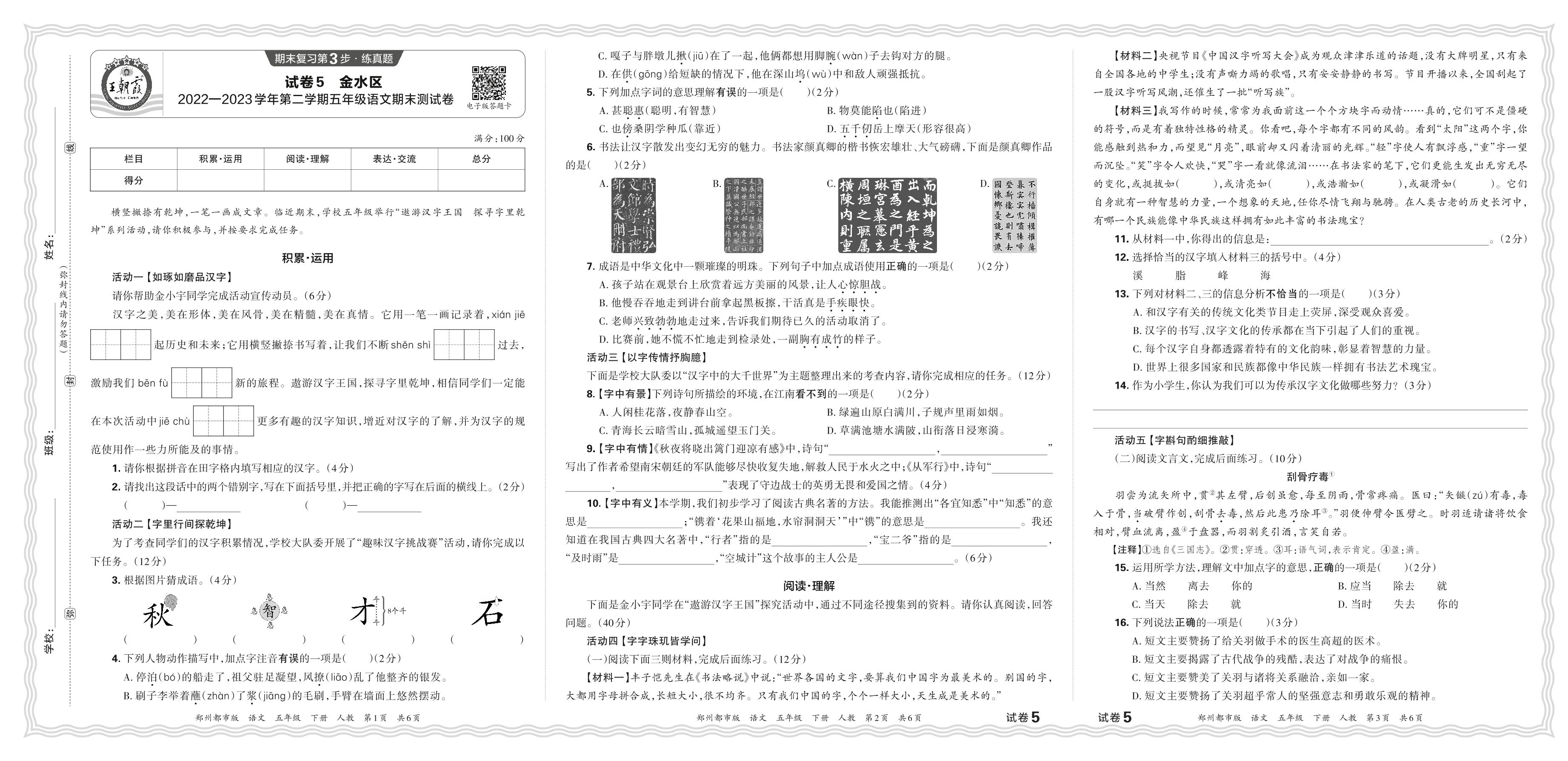 河南省郑州市金水区2022—2023学年下学期五年级语文期末测试卷(人教版)【5】