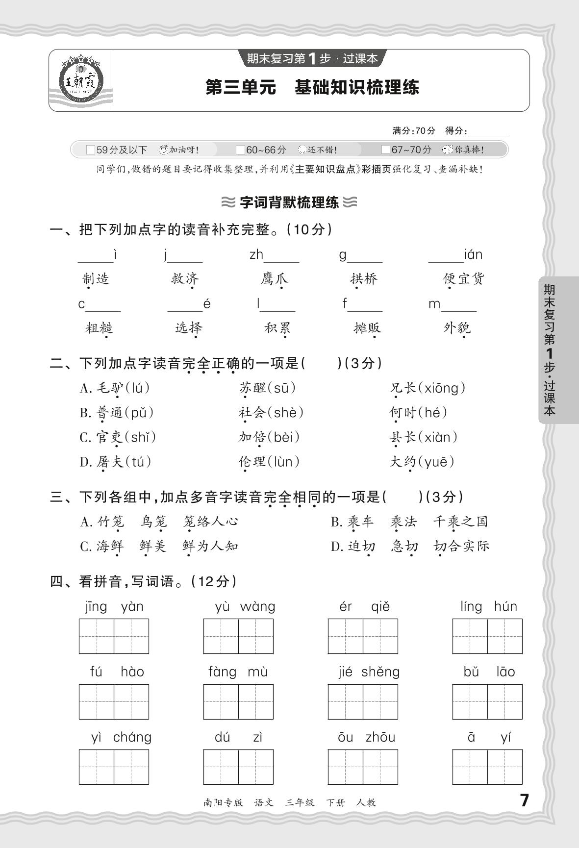 2024春下册三年级语文人教版 期末过课本南阳版·第三单元 基础知识梳理练