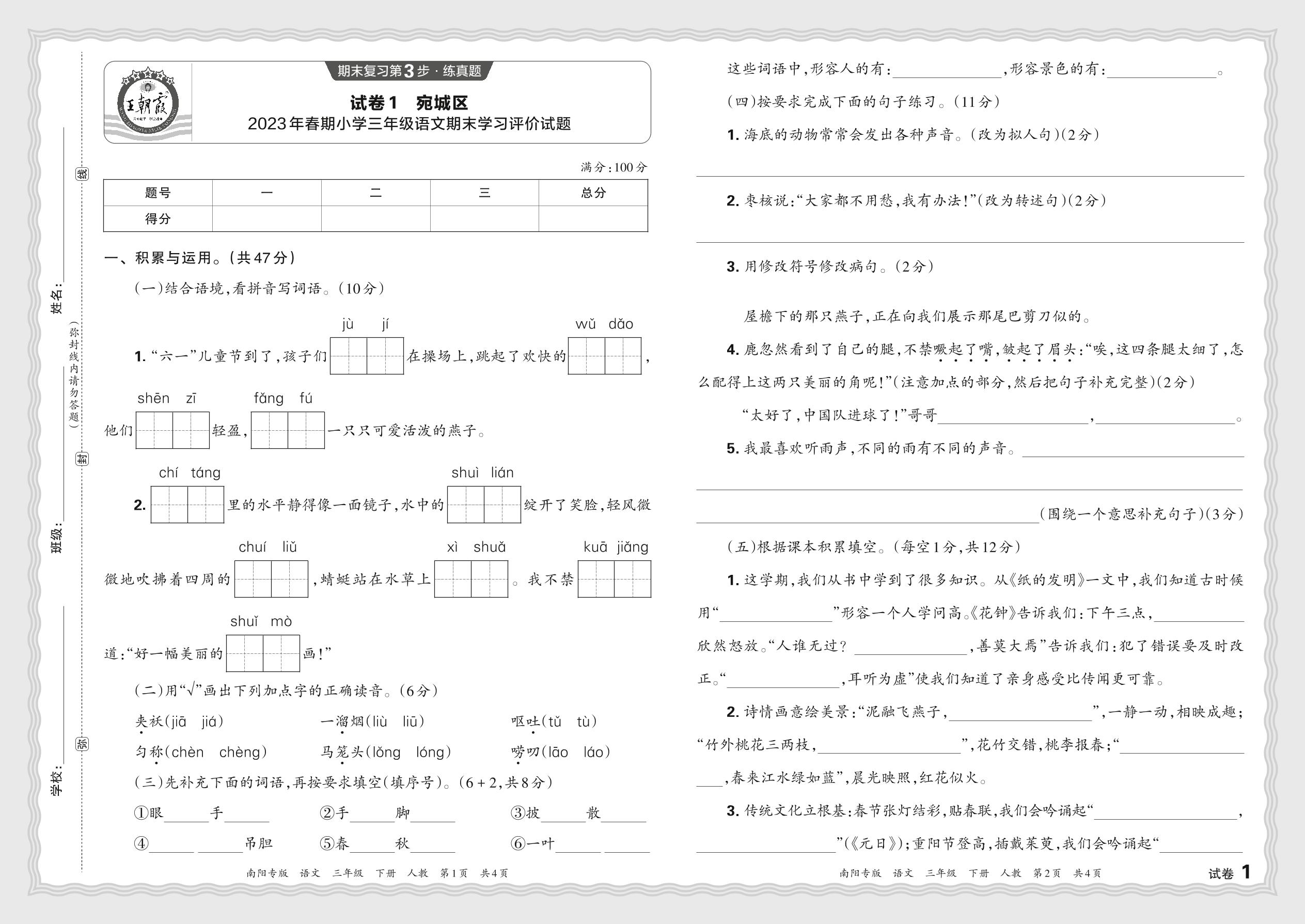 河南省南阳市宛城区2023年春期小学三年级语文期末学习评价试题(人教版)【1】