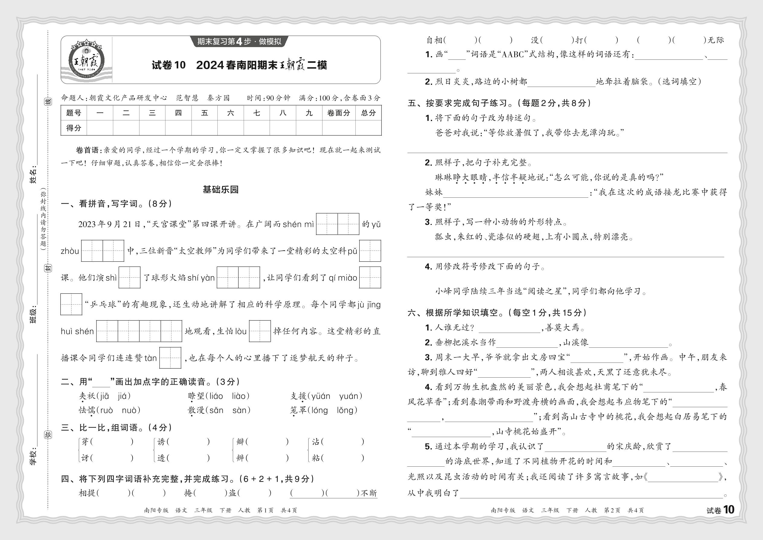 2024春下册三年级语文人教版 河南南阳期末王朝霞二模【10】