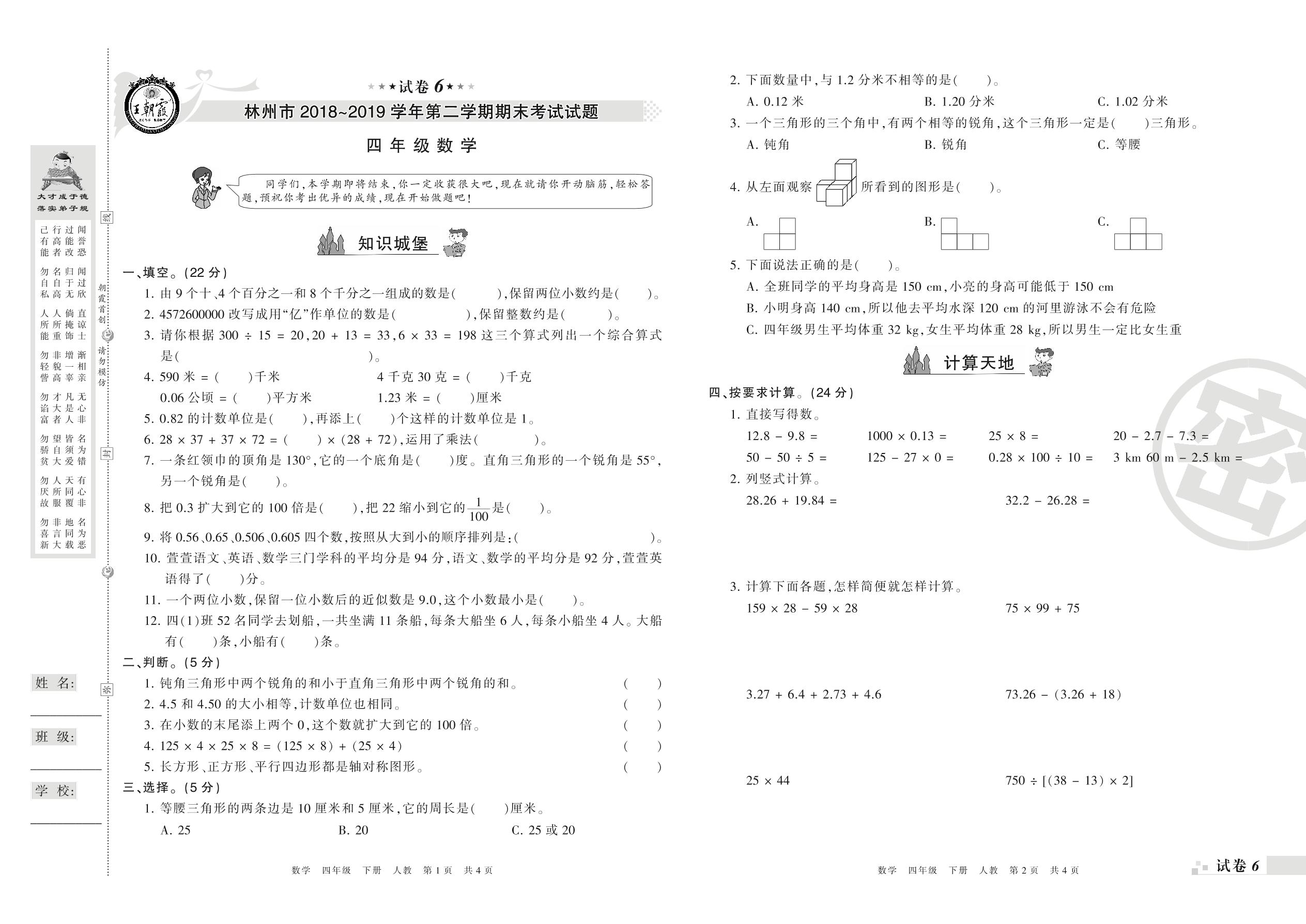 2018-2019学年第二学期林州市四年级数学试卷(人教版)【6】