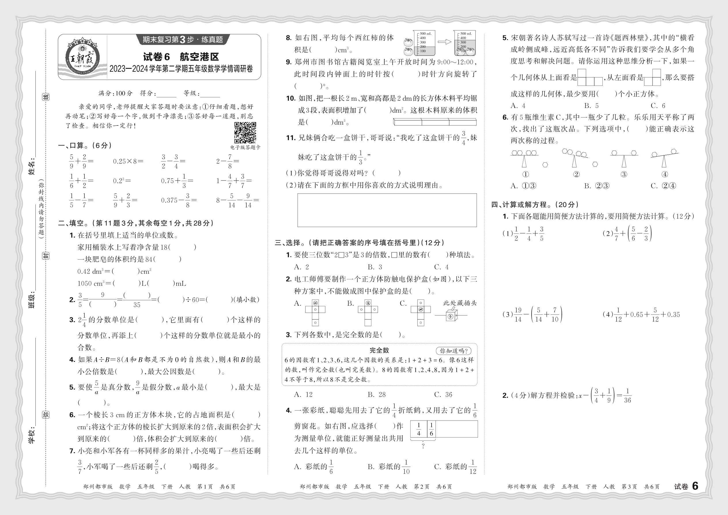 河南省郑州市航空港区2023—2024学年第二学期五年级数学学情调研卷(人教版)【6】