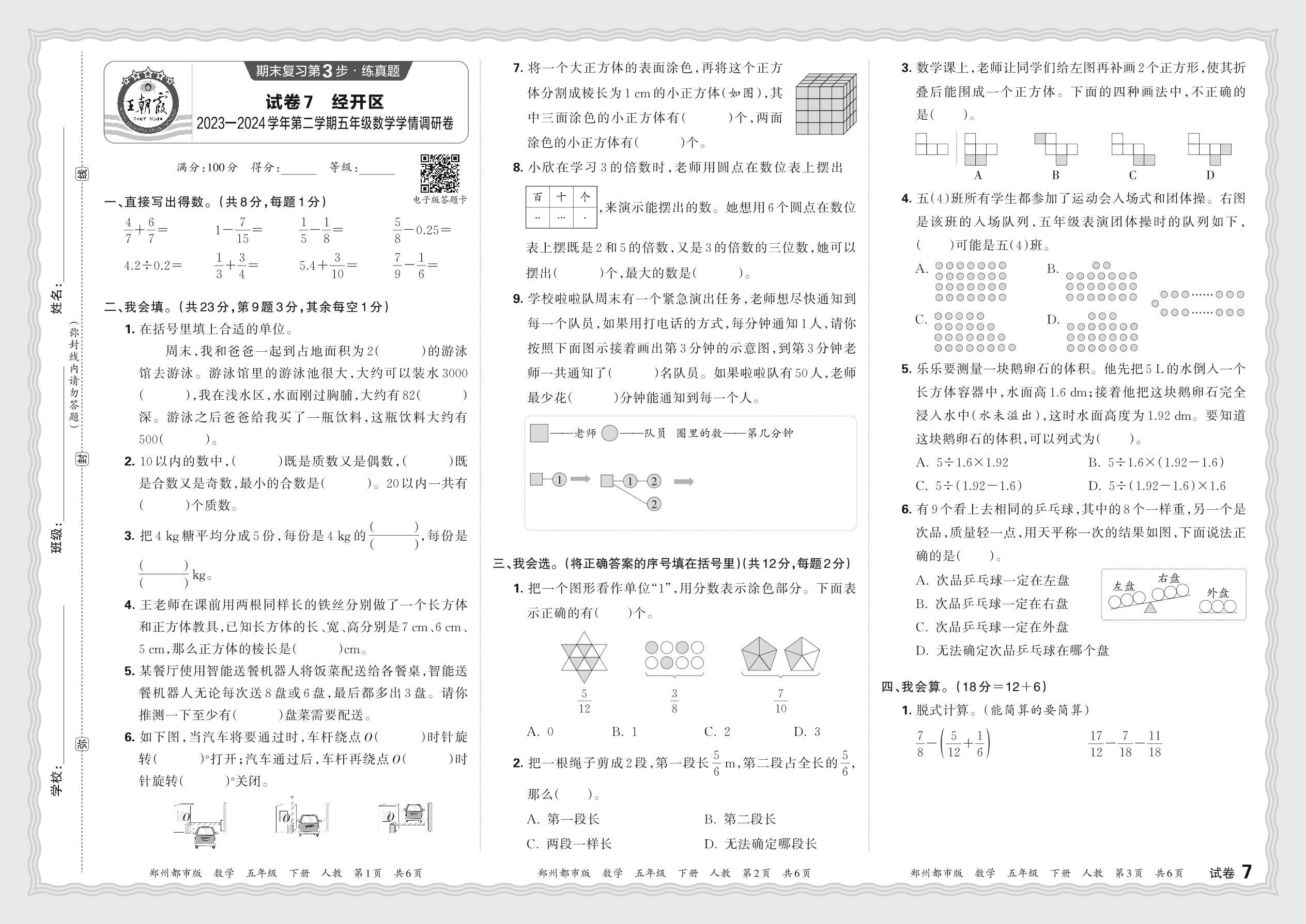 河南省郑州市经开区2023—2024学年第二学期五年级数学学情调研卷(人教版)【7】