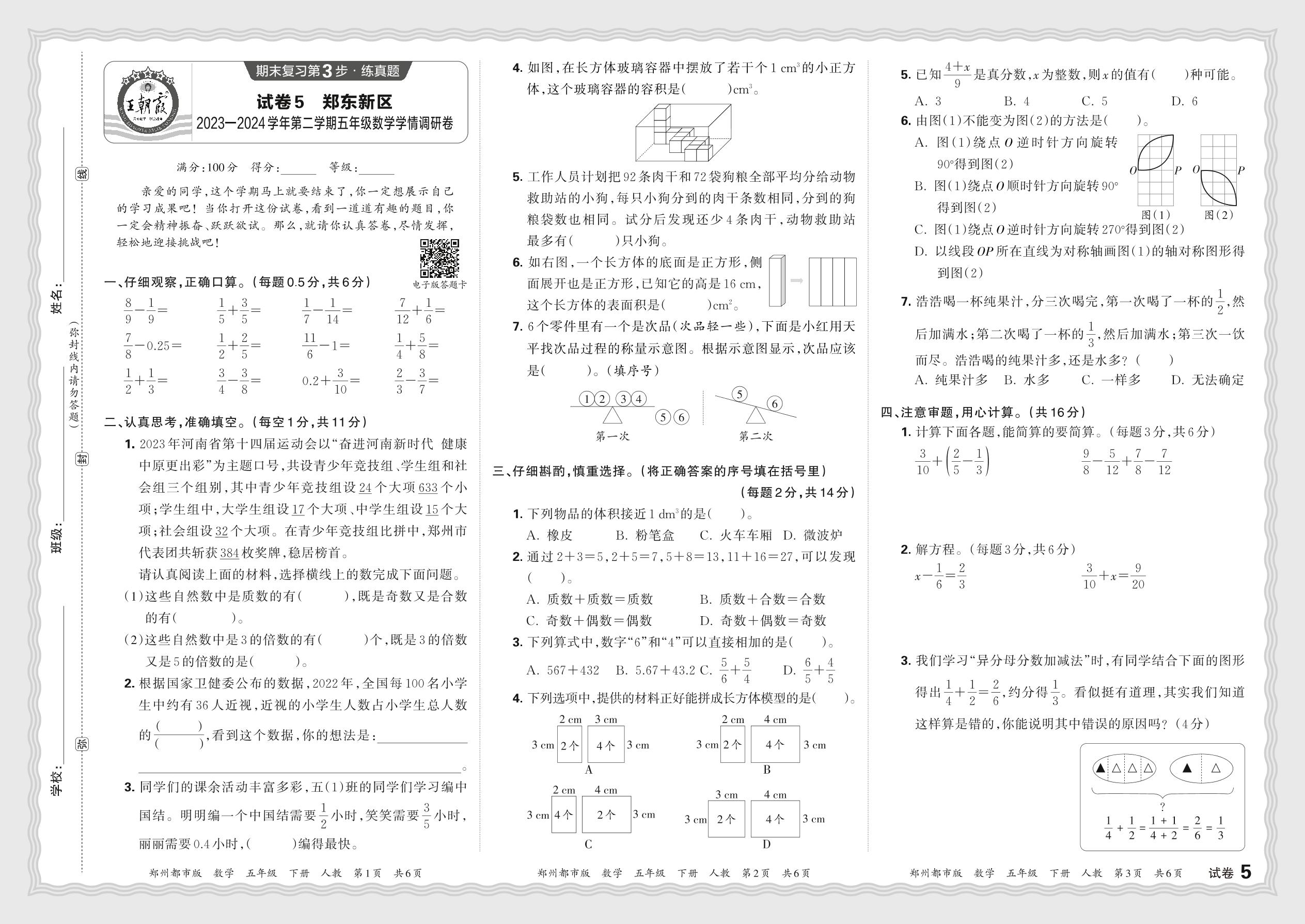 河南省郑州市郑东新区2023—2024学年第二学期五年级数学学情调研卷(人教版)【5】