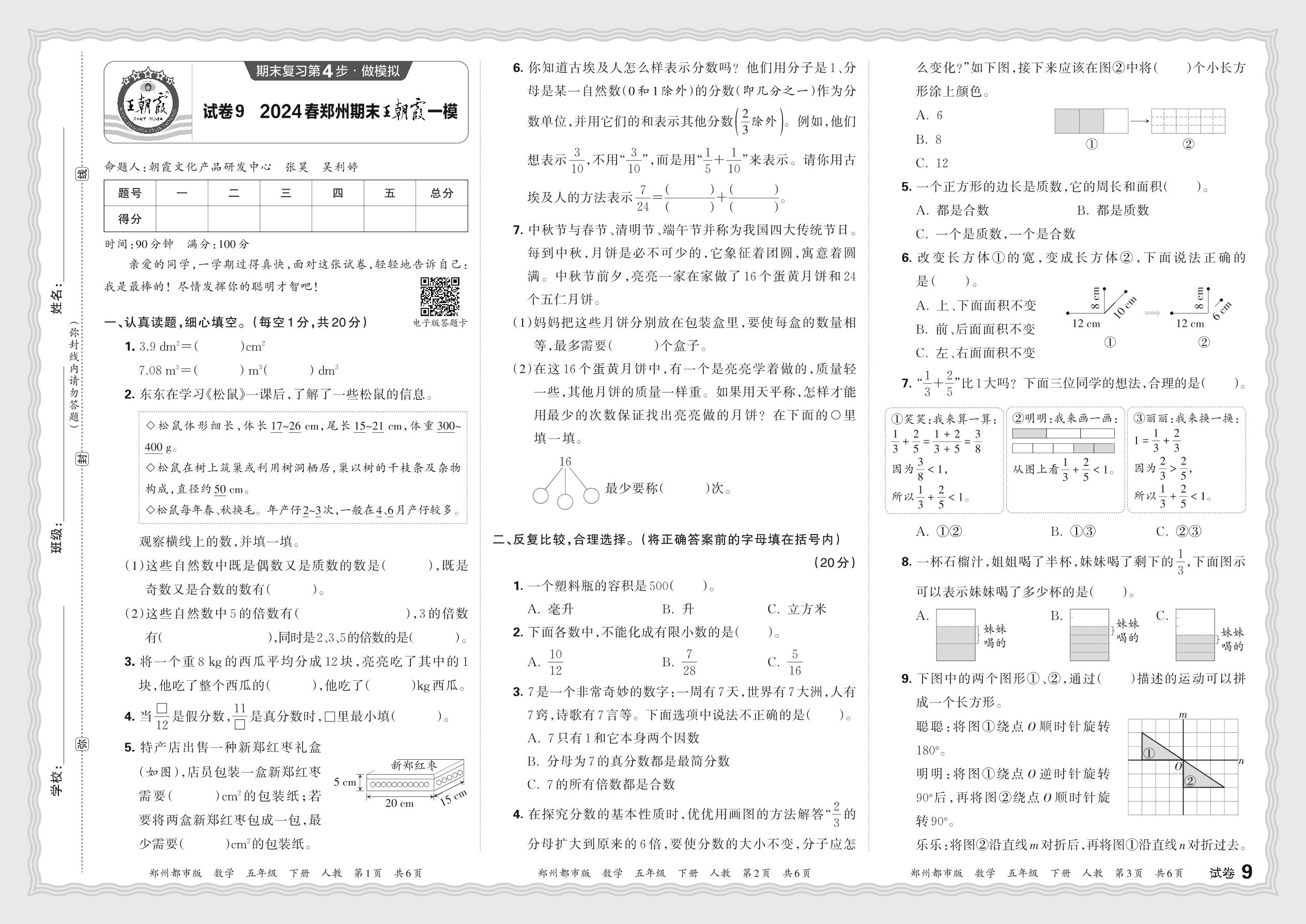 2024春下册五年级数学人教版 河南郑州期末王朝霞一模
