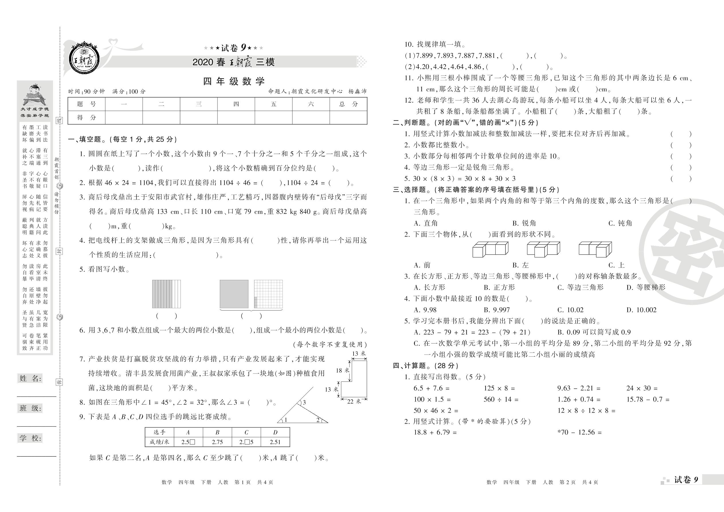 王朝霞期末模拟卷四年级下册数学(人教版)_R210804142220【9】