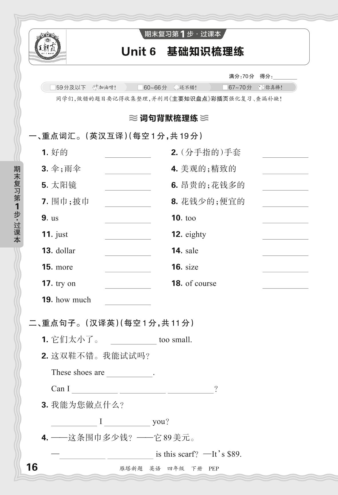 2024春下册四年级英语人教PEP版 期末过课本西安版·Unit 6 基础知识梳理练