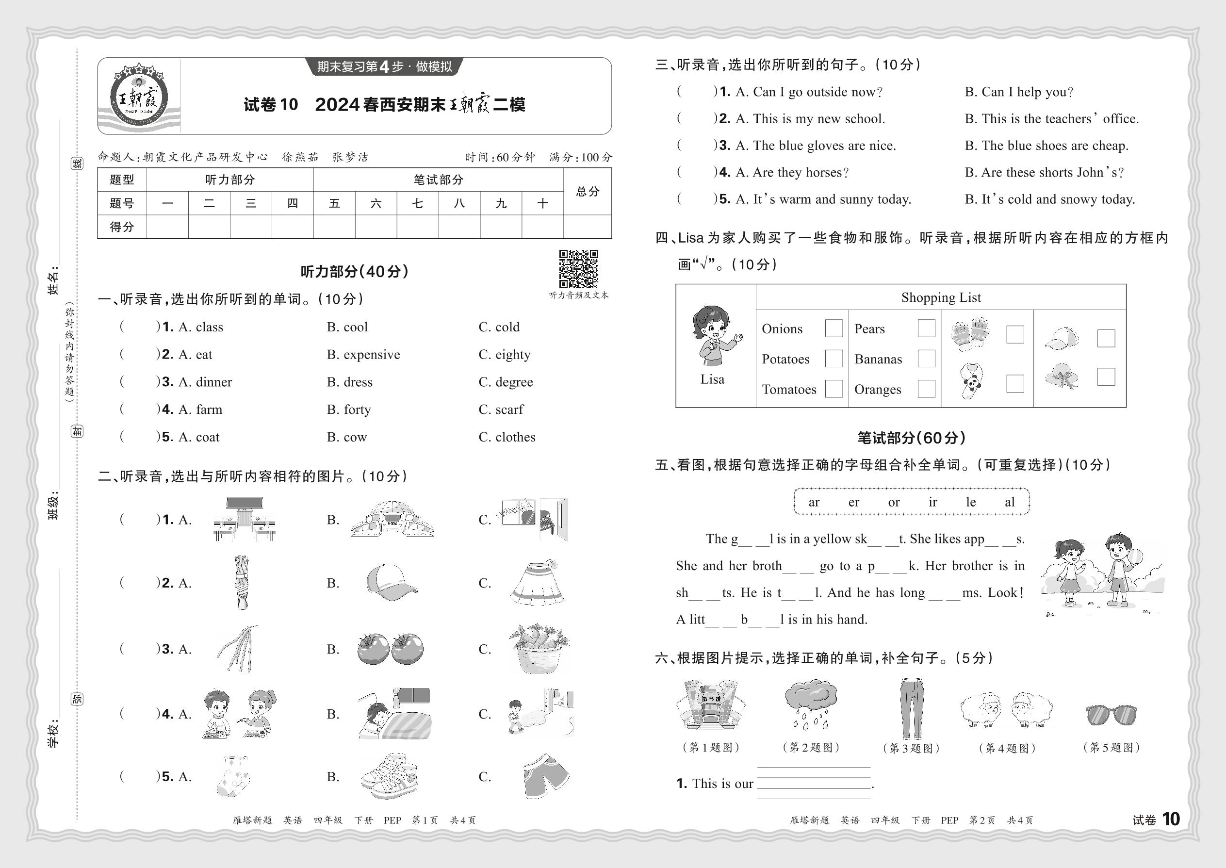 2024春下册四年级英语人教PEP版 陕西西安期末王朝霞二模