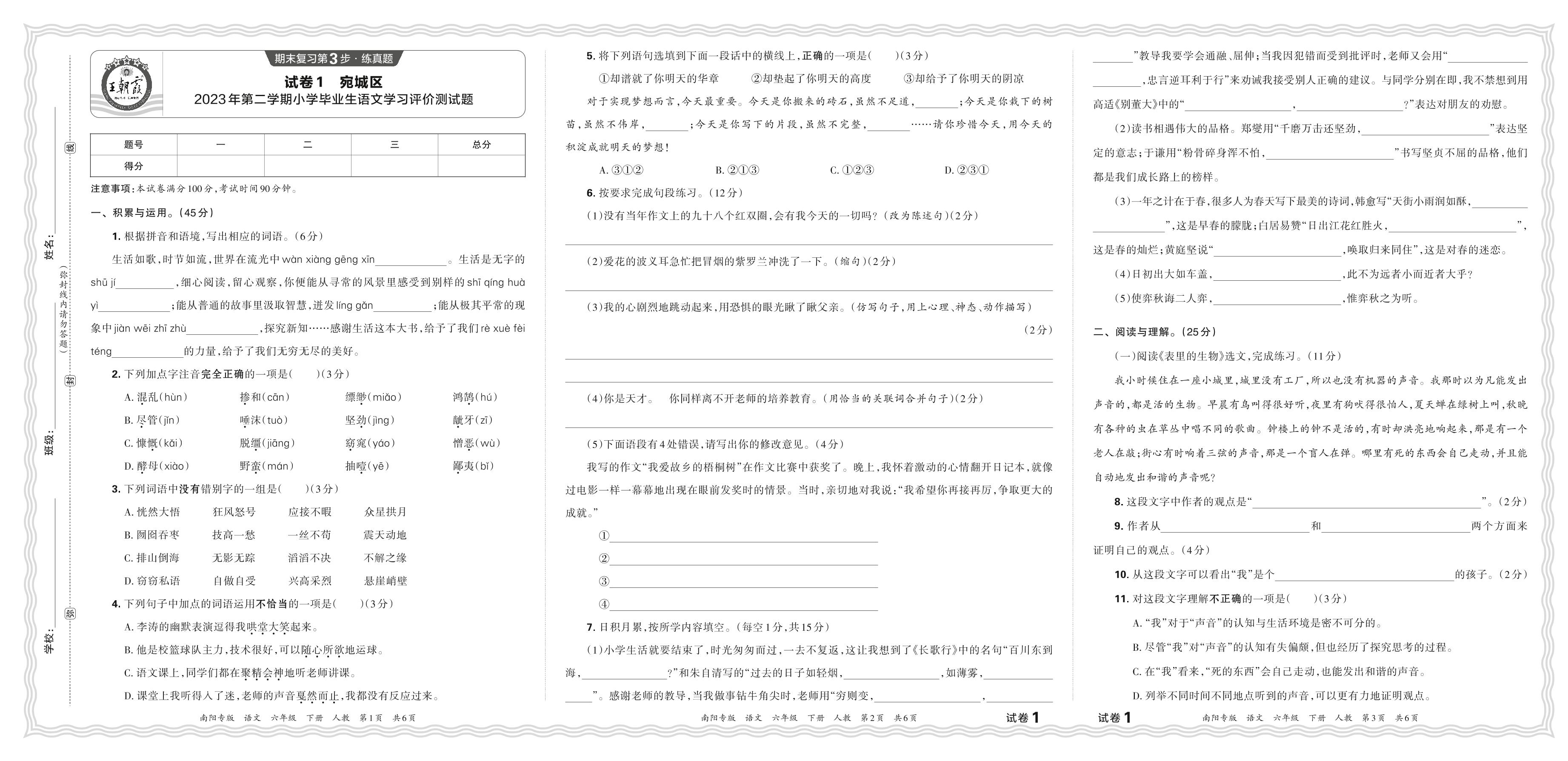 河南省南阳市宛城区2023年第二学期小学毕业生语文学习评价测试题(人教版)【1】