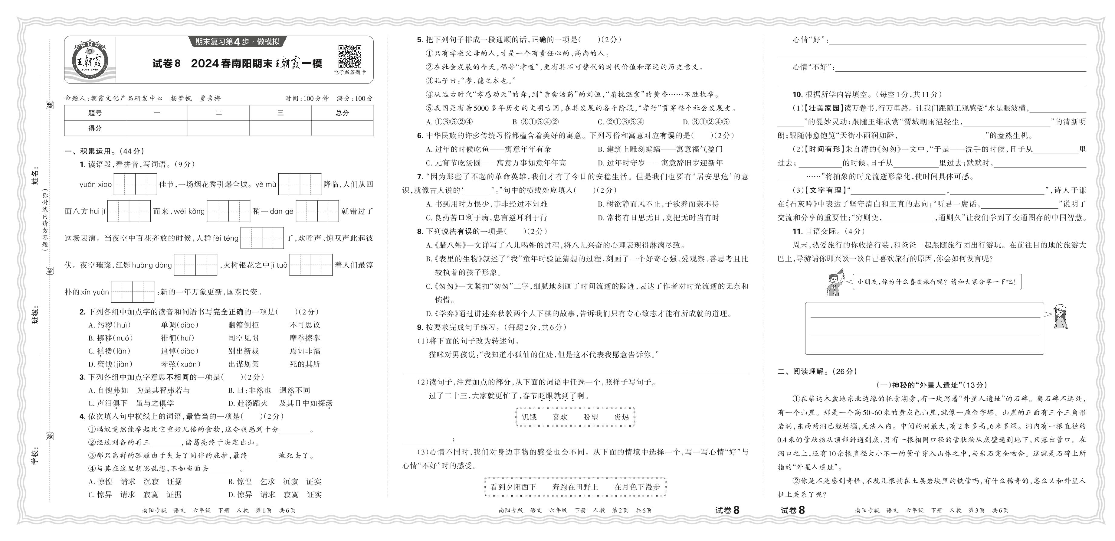 2024春下册六年级语文人教版 河南南阳期末王朝霞一模【8】