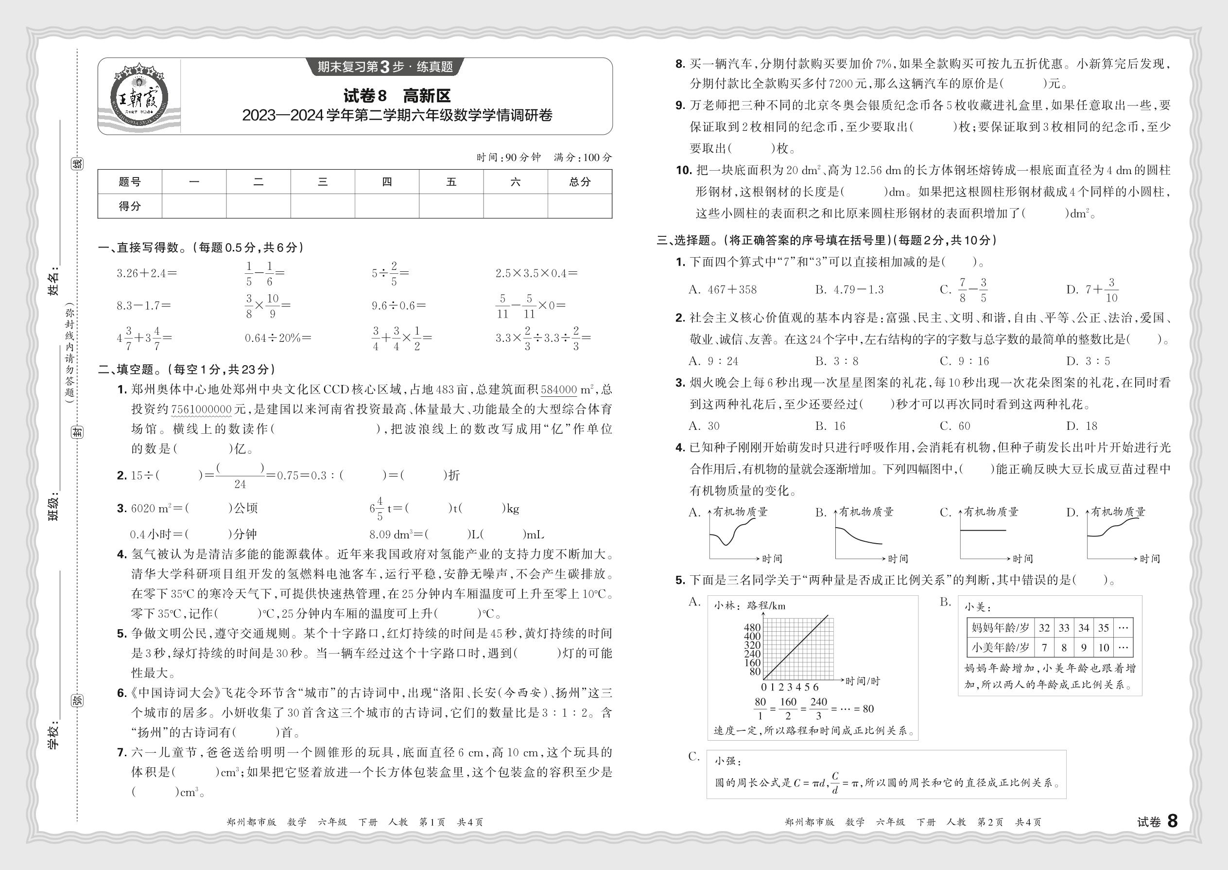 河南省郑州市高新区2023—2024学年第二学期六年级数学学情调研卷(人教版)【8】