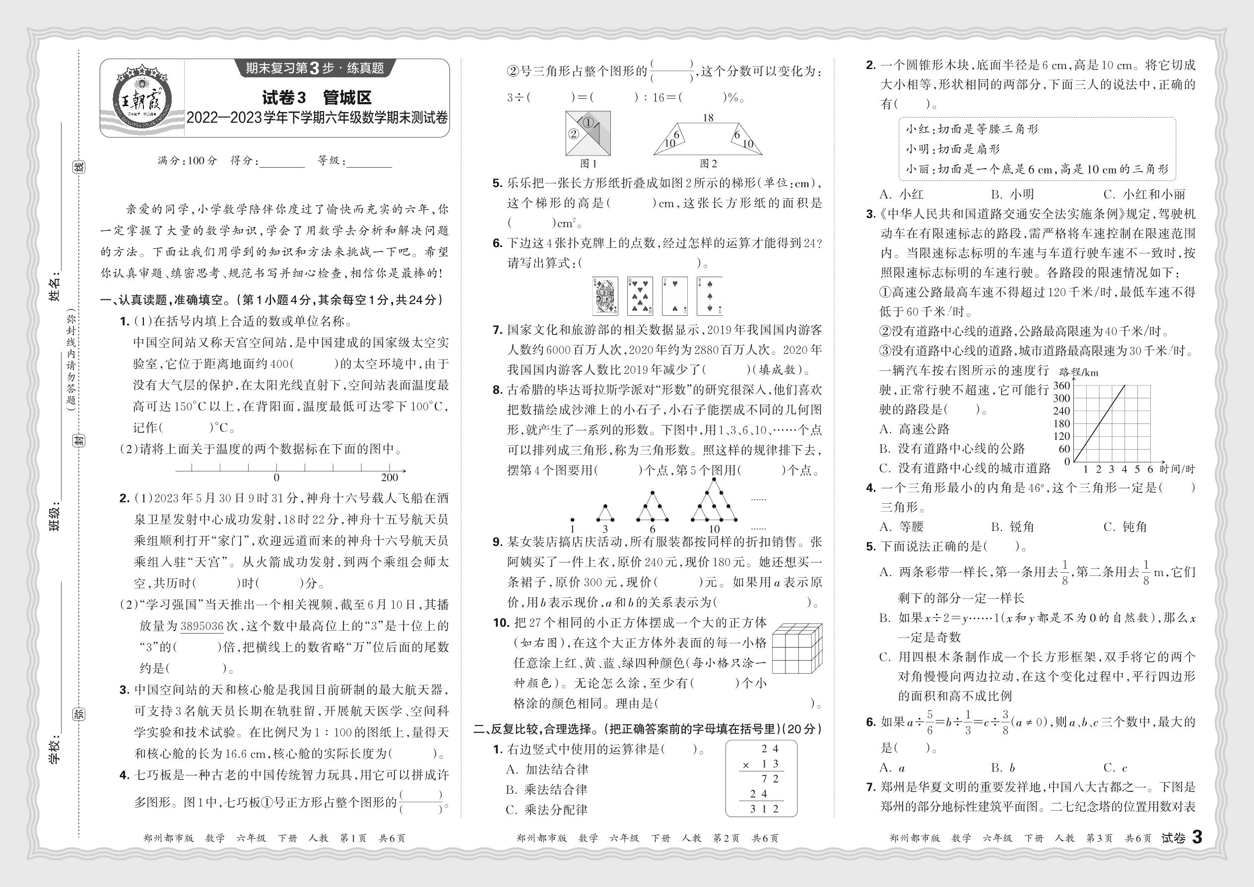 河南省郑州市管城区2022—2023学年下学期六年级数学期末测试卷(人教版)【3】