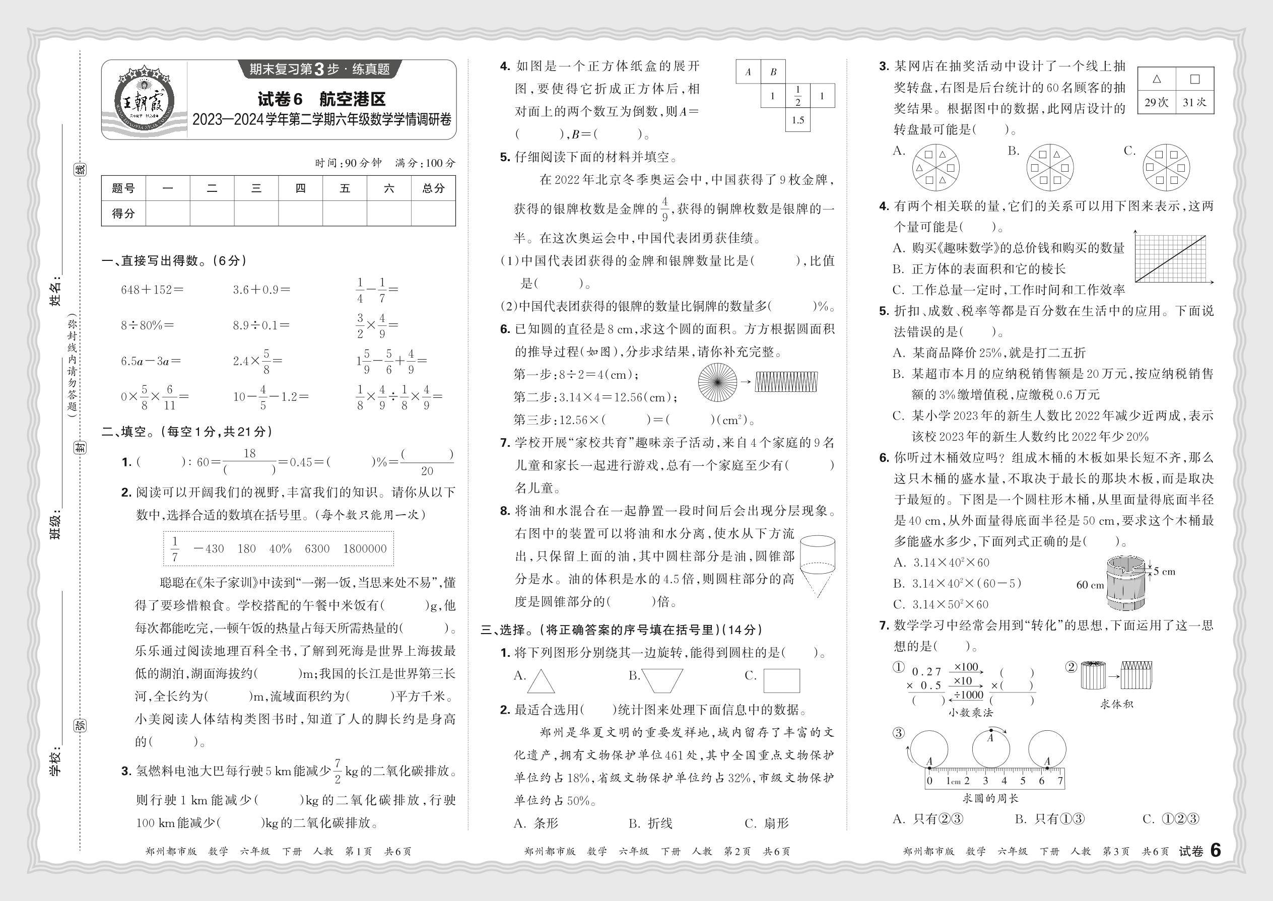 河南省郑州市航空港区2023—2024学年第二学期六年级数学学情调研卷(人教版)【6】