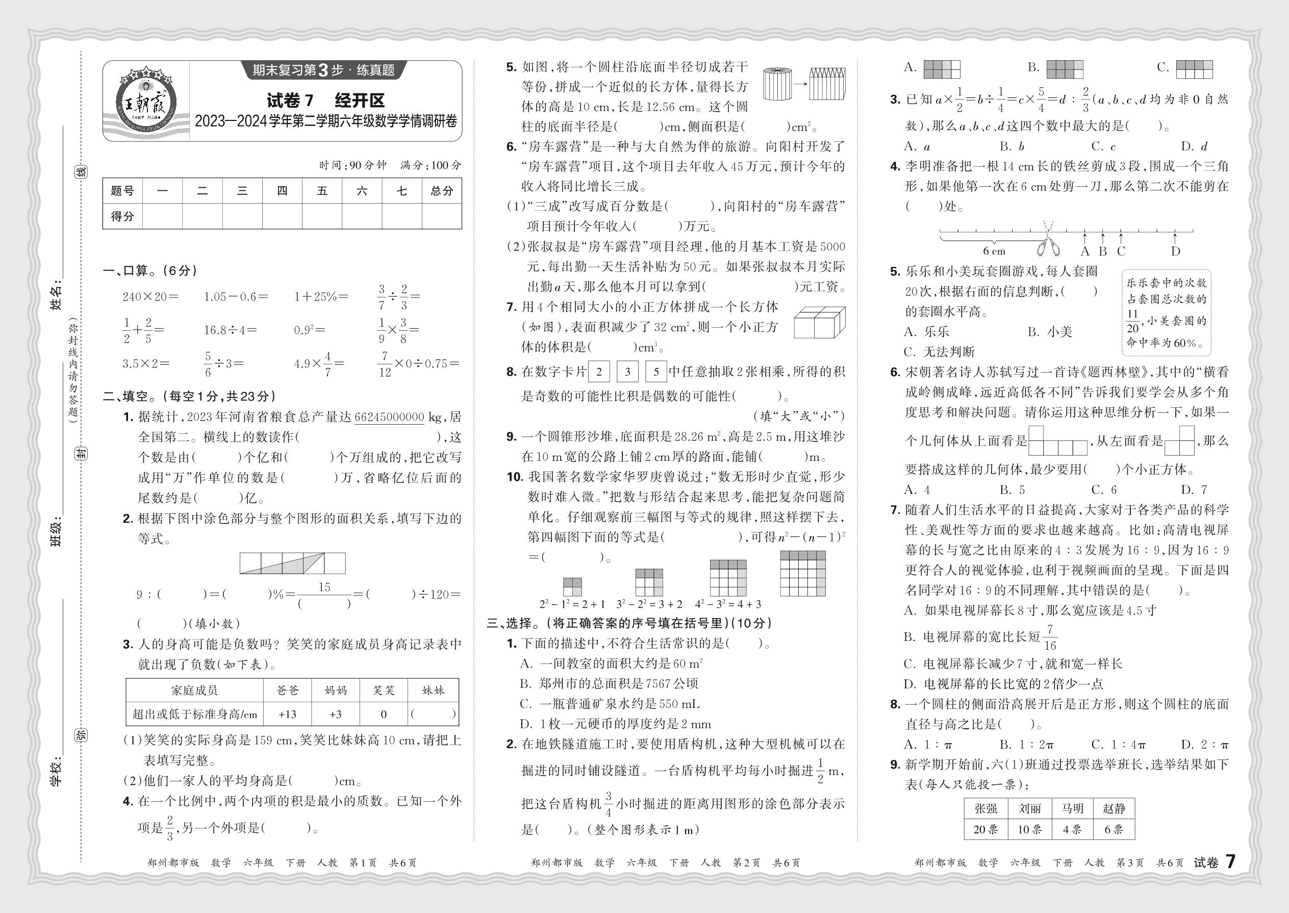 河南省郑州市经开区2023—2024学年第二学期六年级数学学情调研卷(人教版)【7】