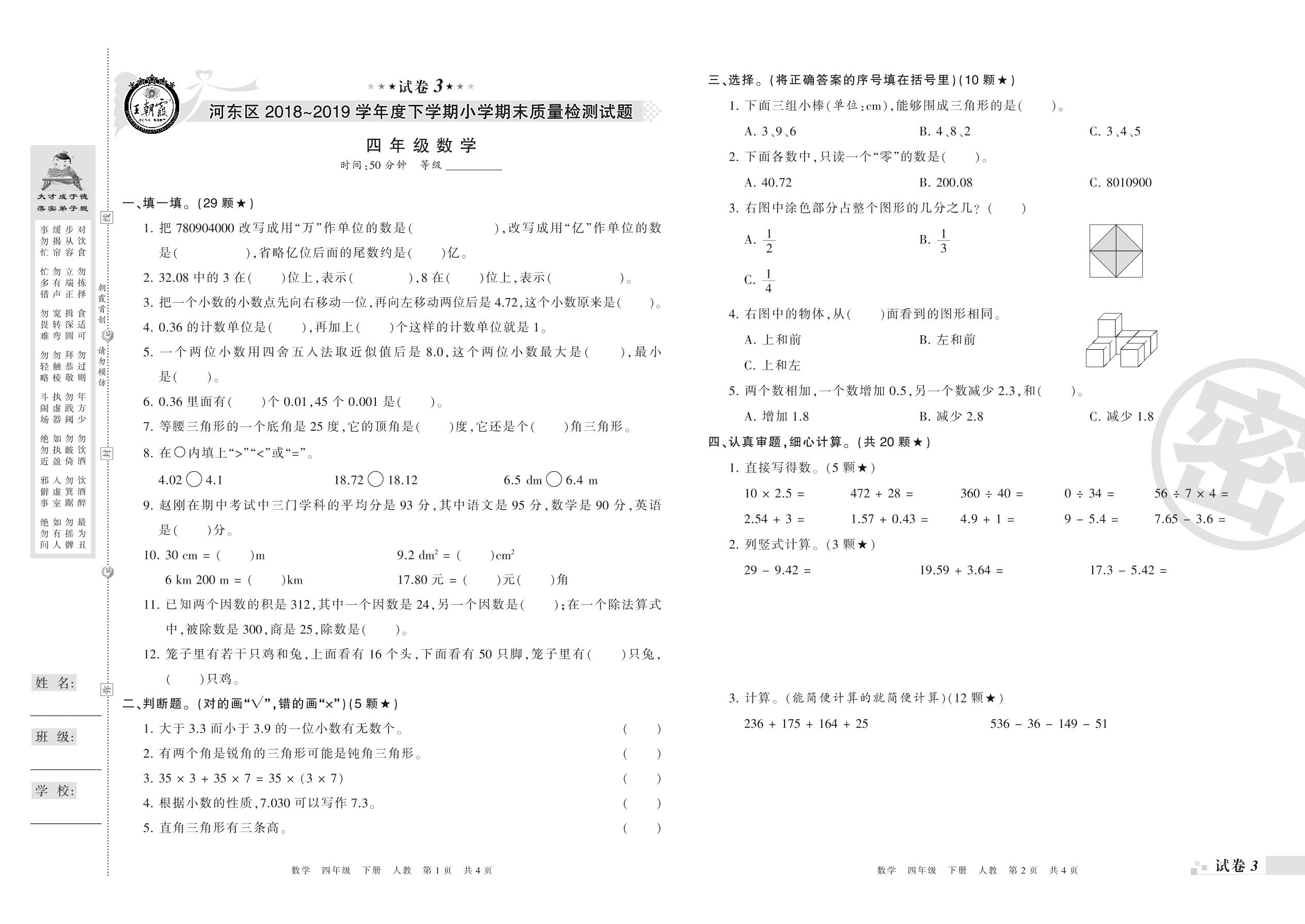2018-2019学年第二学期临沂市河东区四年级数学试卷(人教版)【3】