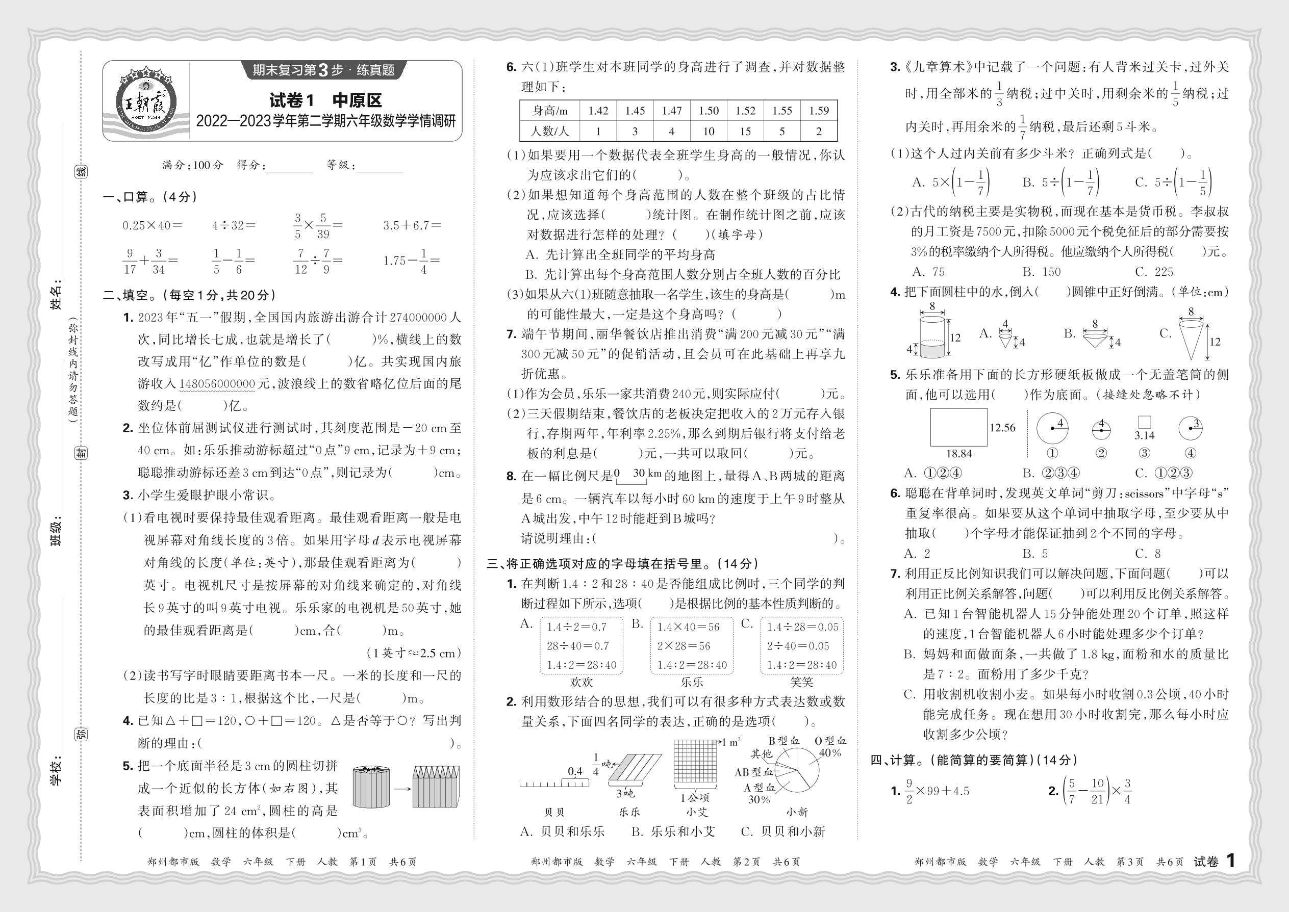 河南省郑州市中原区2022—2023学年第二学期六年级数学学情调研(人教版)_R240423141441132【1】