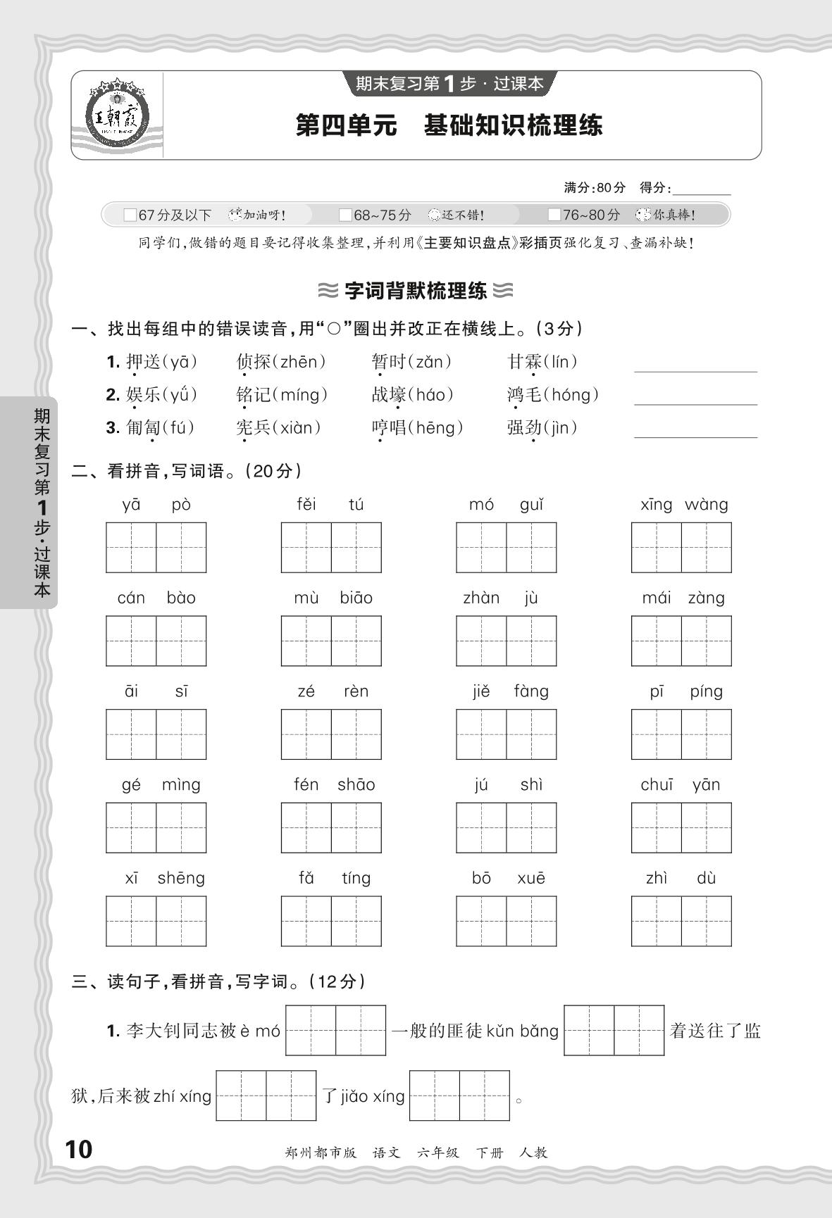 2024春下册六年级语文人教版 期末过课本郑州版·第四单元 基础知识梳理练