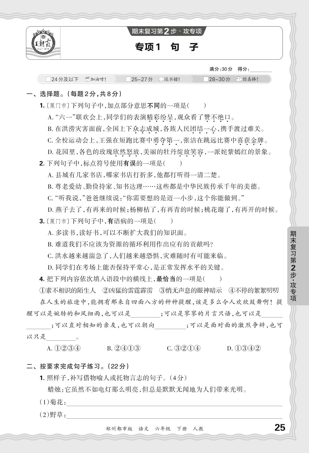 2024春下册六年级语文人教版 期末专项卷郑州版·句子