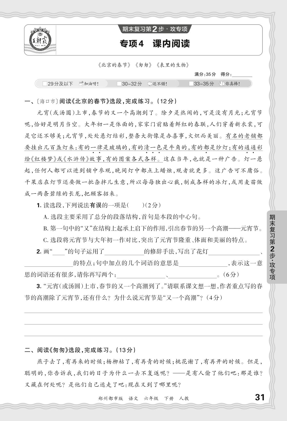 2024春下册六年级语文人教版 期末专项卷郑州版·课内阅读