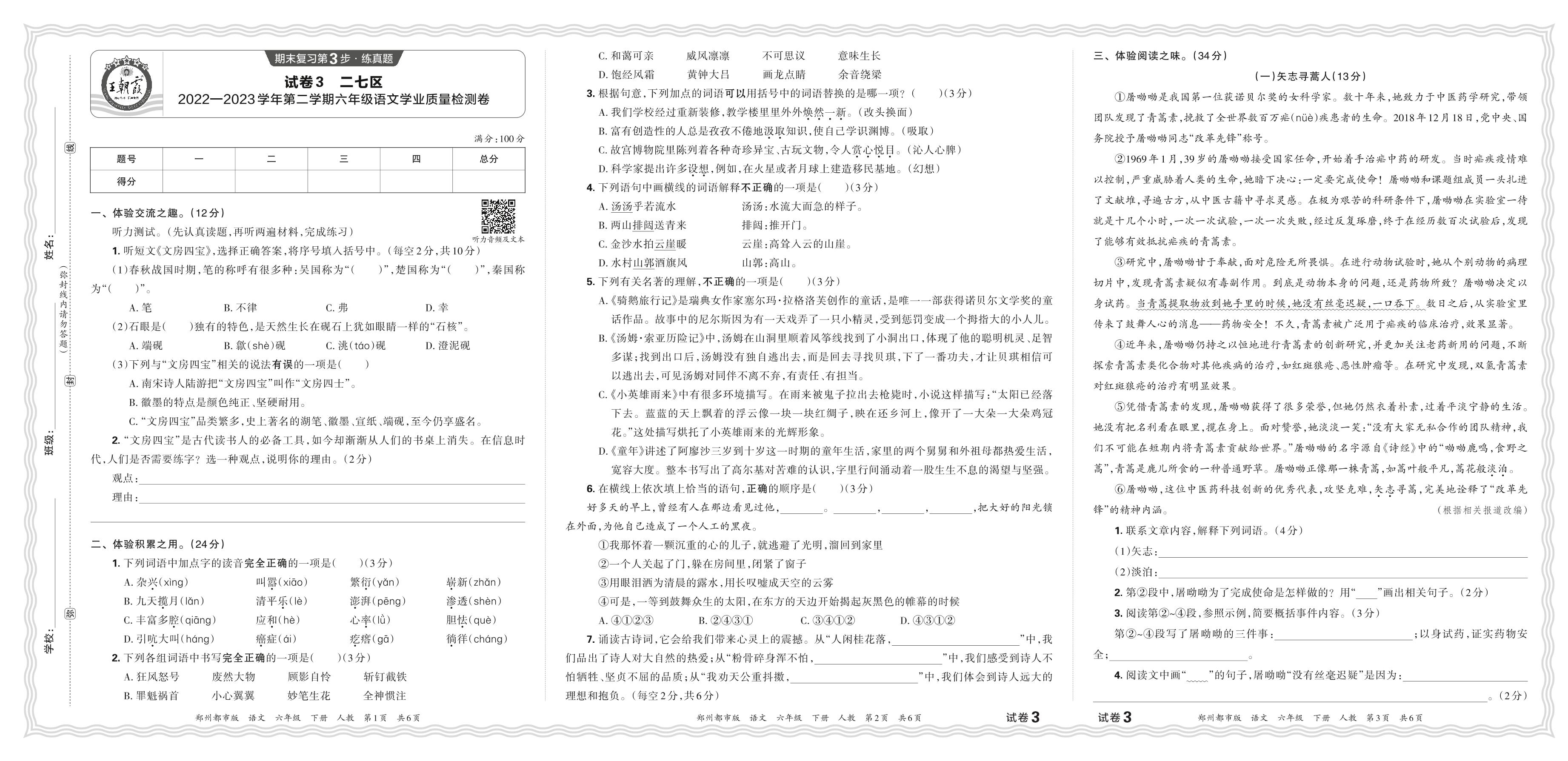 河南省郑州市二七区2022—2023学年第二学期六年级语文学业质量检测卷(人教版)【3】