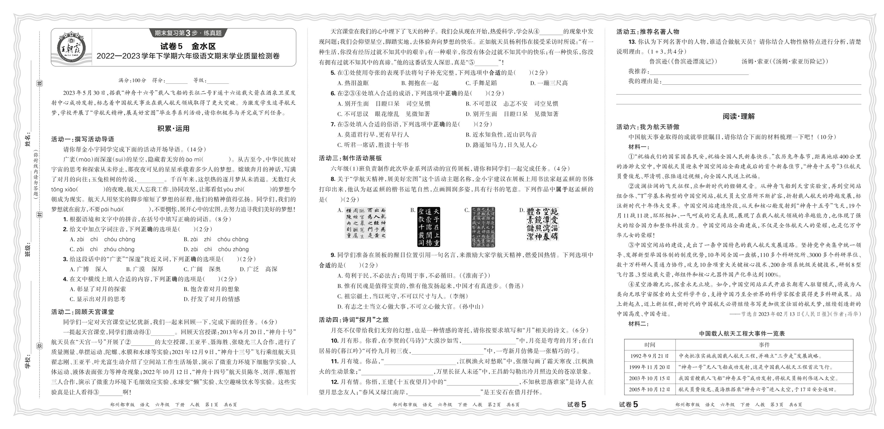 河南省郑州市金水区2022—2023学年下学期六年级语文期末学业质量检测卷(人教版)【5】