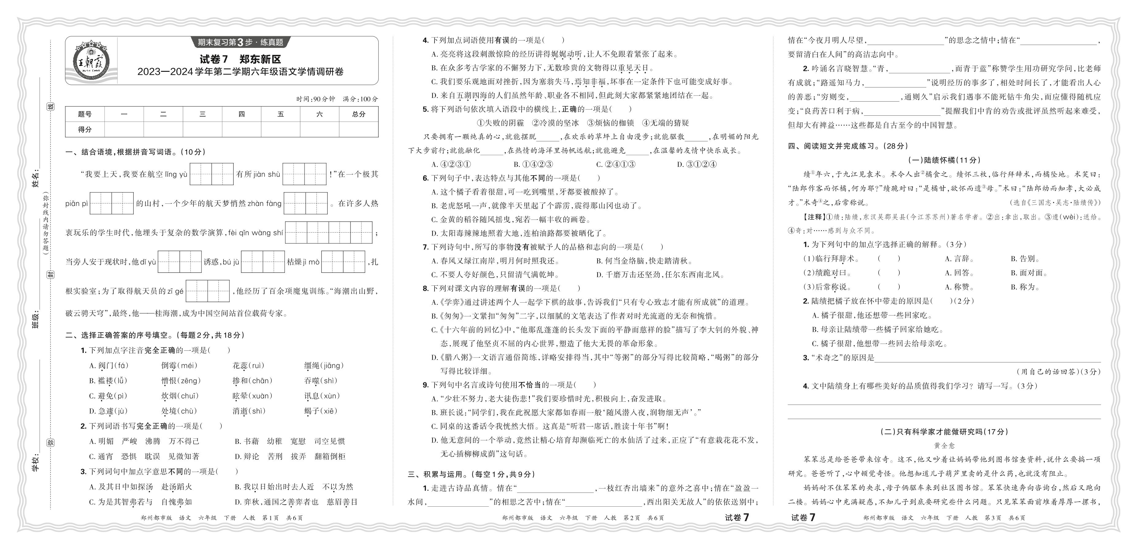 河南省郑州市郑东新区2023—2024学年第二学期六年级语文期末学情调研试卷(人教版)【7】