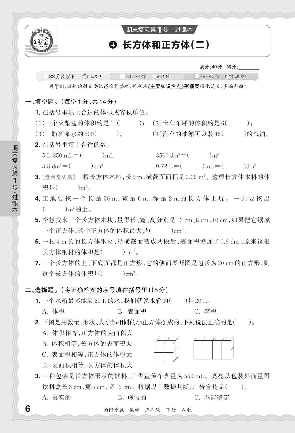 2024春下册五年级数学人教版 期末过课本南阳版·长方体和正方体(二)【4】