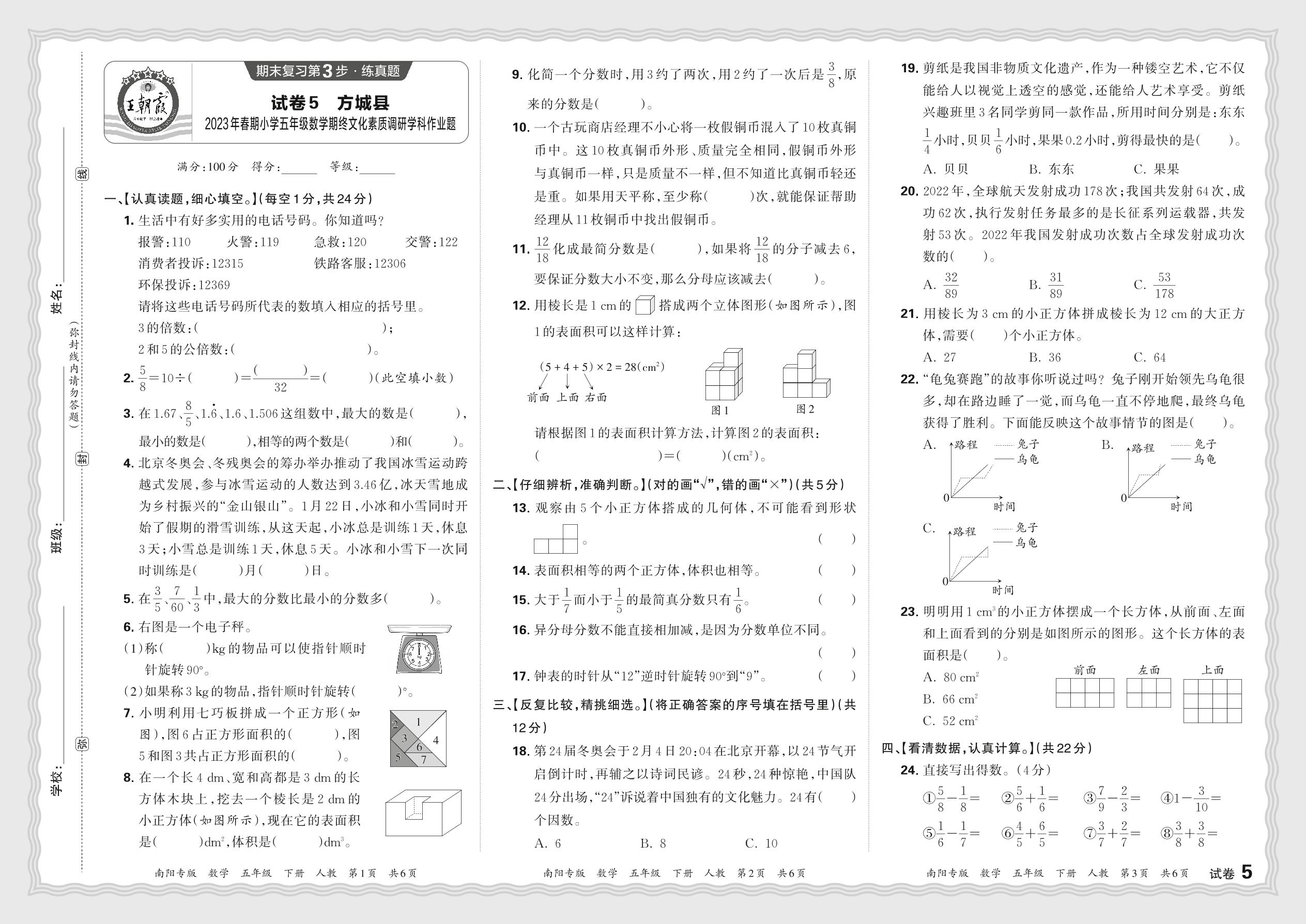 河南省南阳市方城县2023年春期小学五年级数学期终文化素质调研学科作业题(人教版)【5】