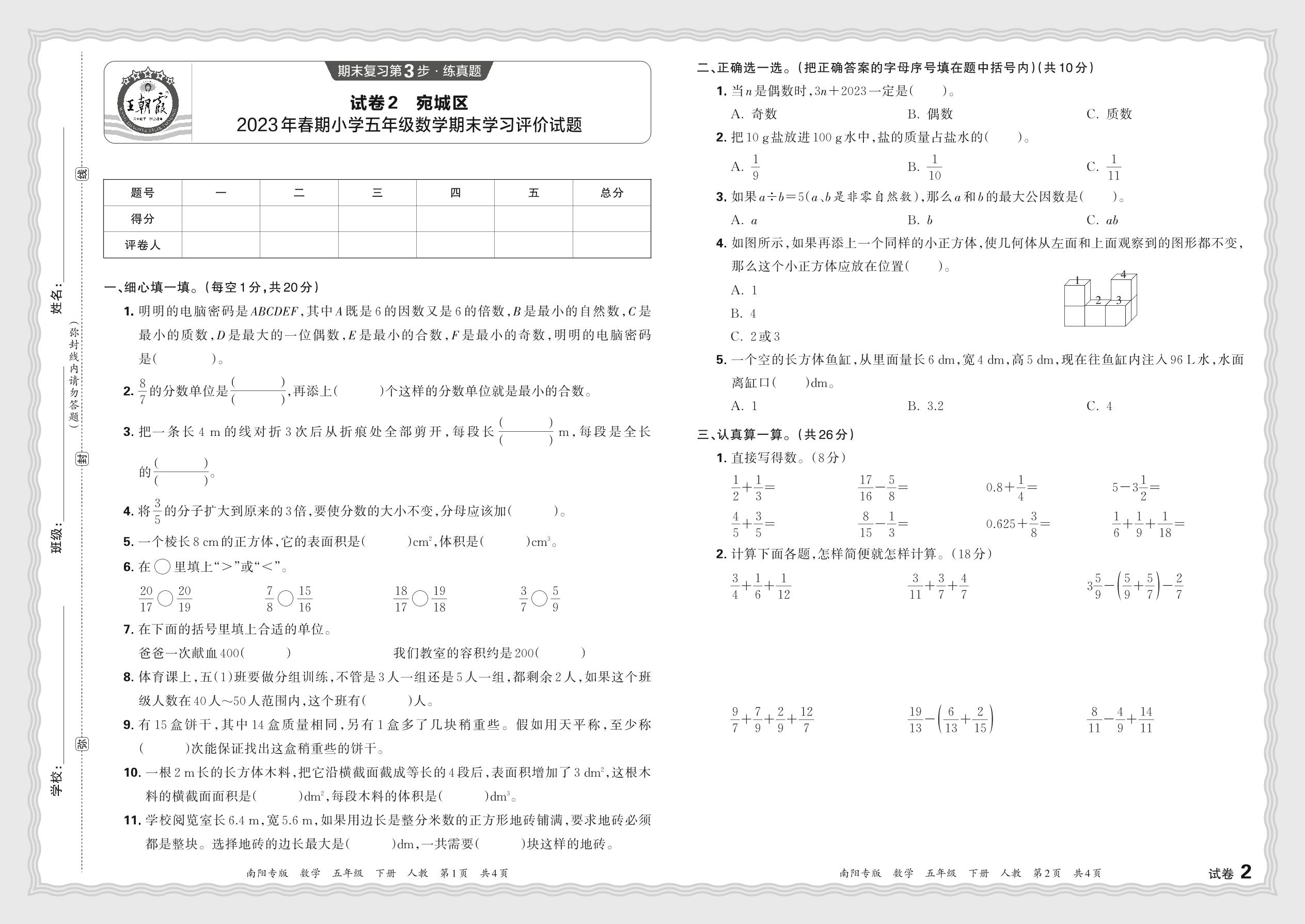 河南省南阳市宛城区2023年春期小学五年级数学期末学习评价试题(人教版)【2】