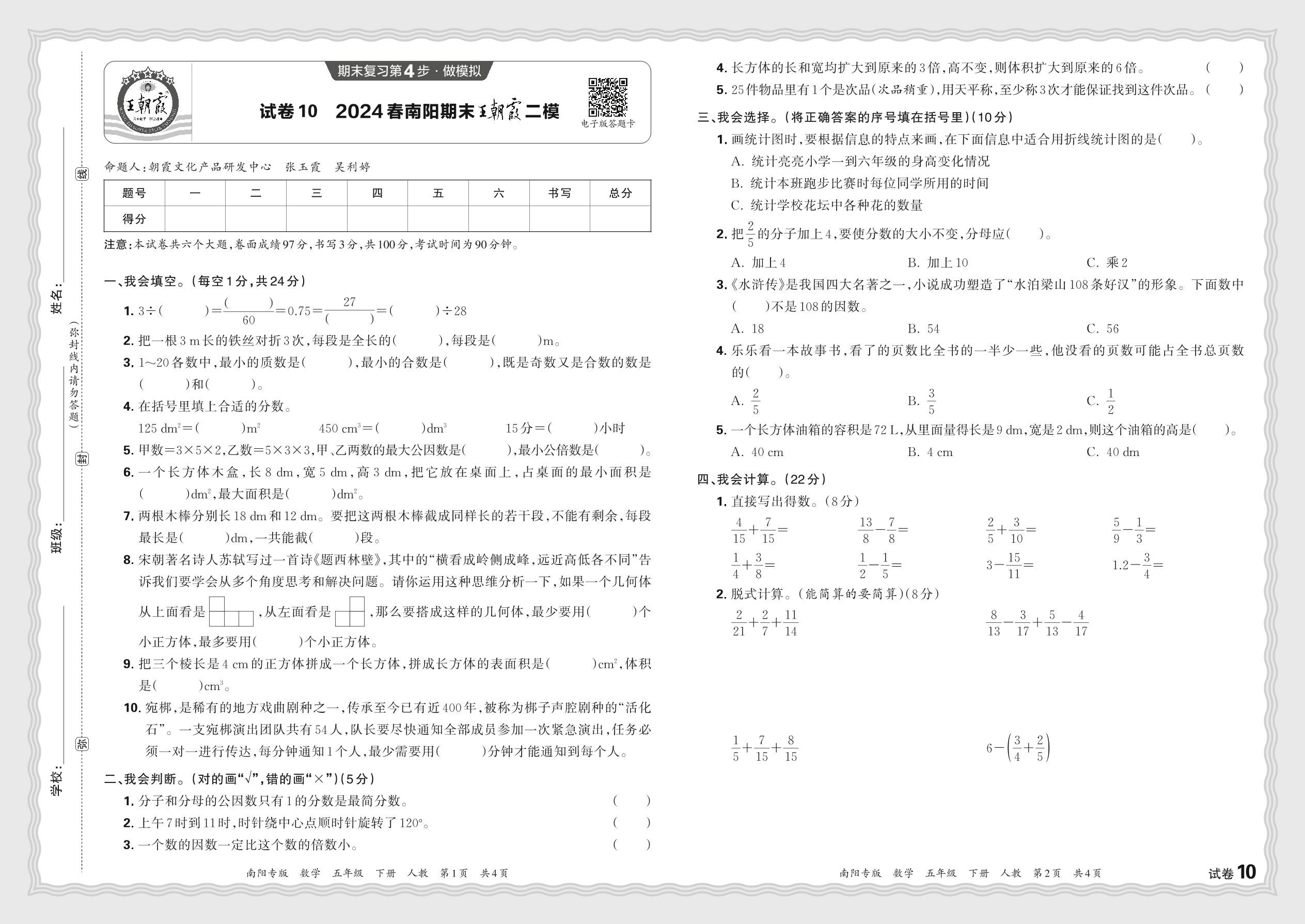 2024春下册五年级数学人教版 河南南阳期末王朝霞二模【10】