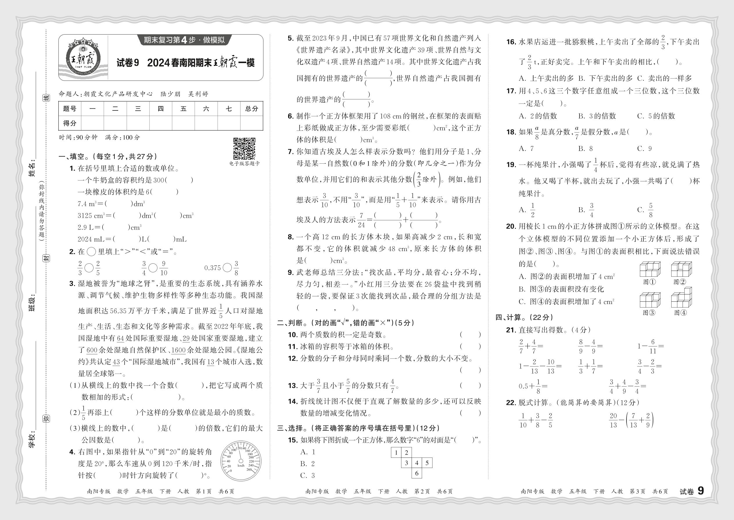 2024春下册五年级数学人教版 河南南阳期末王朝霞一模【9】