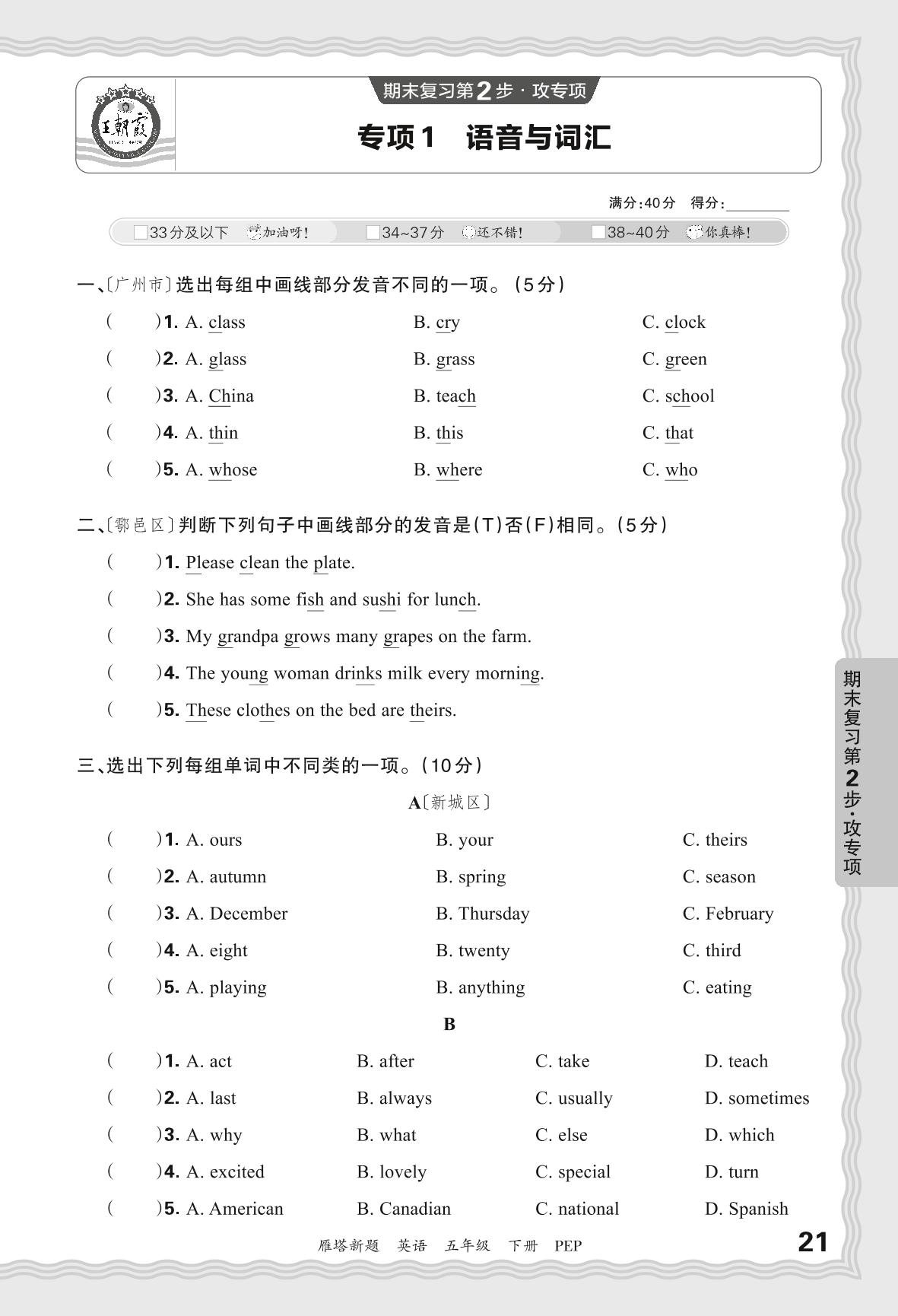 2024春下册五年级英语人教PEP版 期末专项卷西安版·语音与词汇【1】