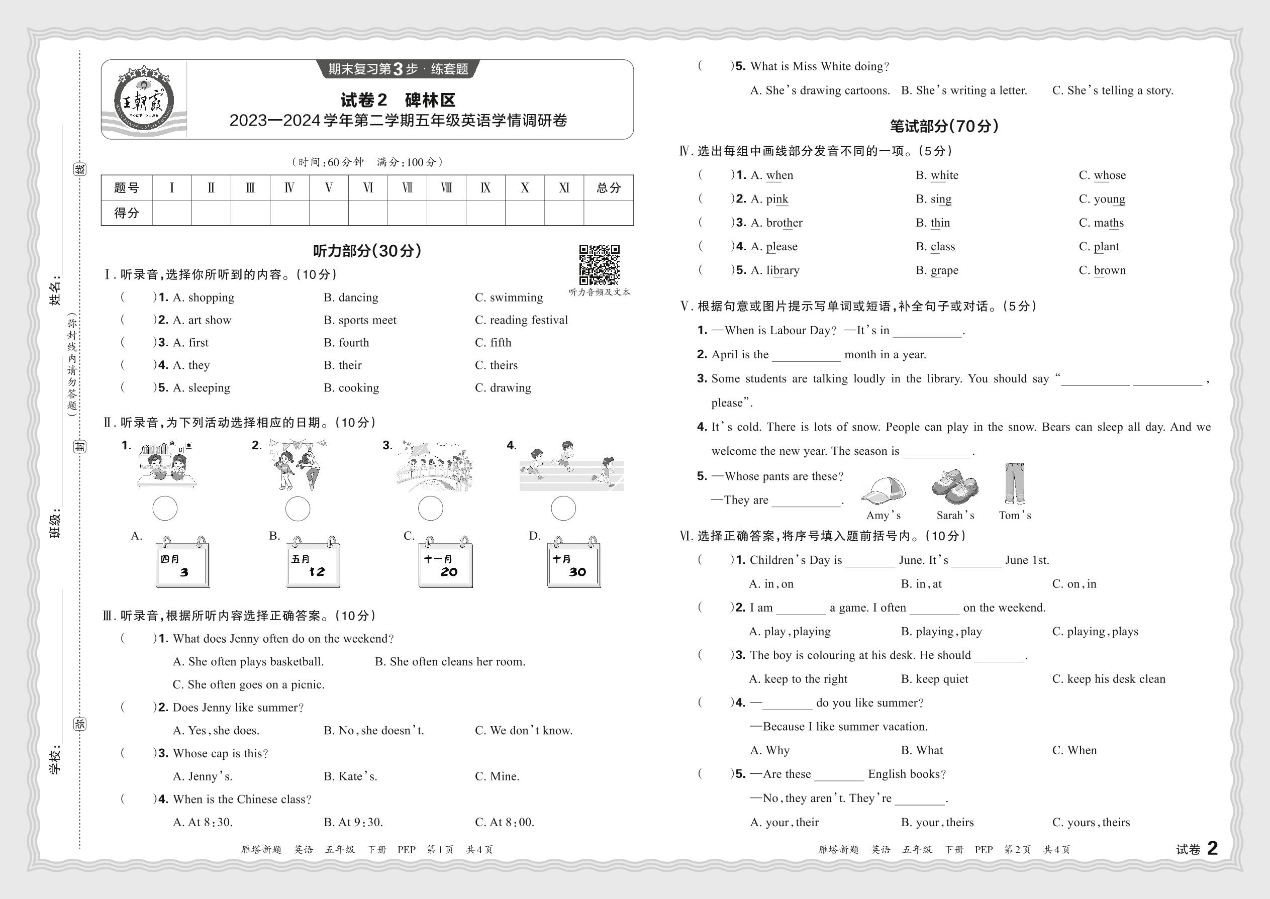 陕西省西安市碑林区2023—2024学年第二学期五年级英语学情调研卷(人教PEP版)【2】