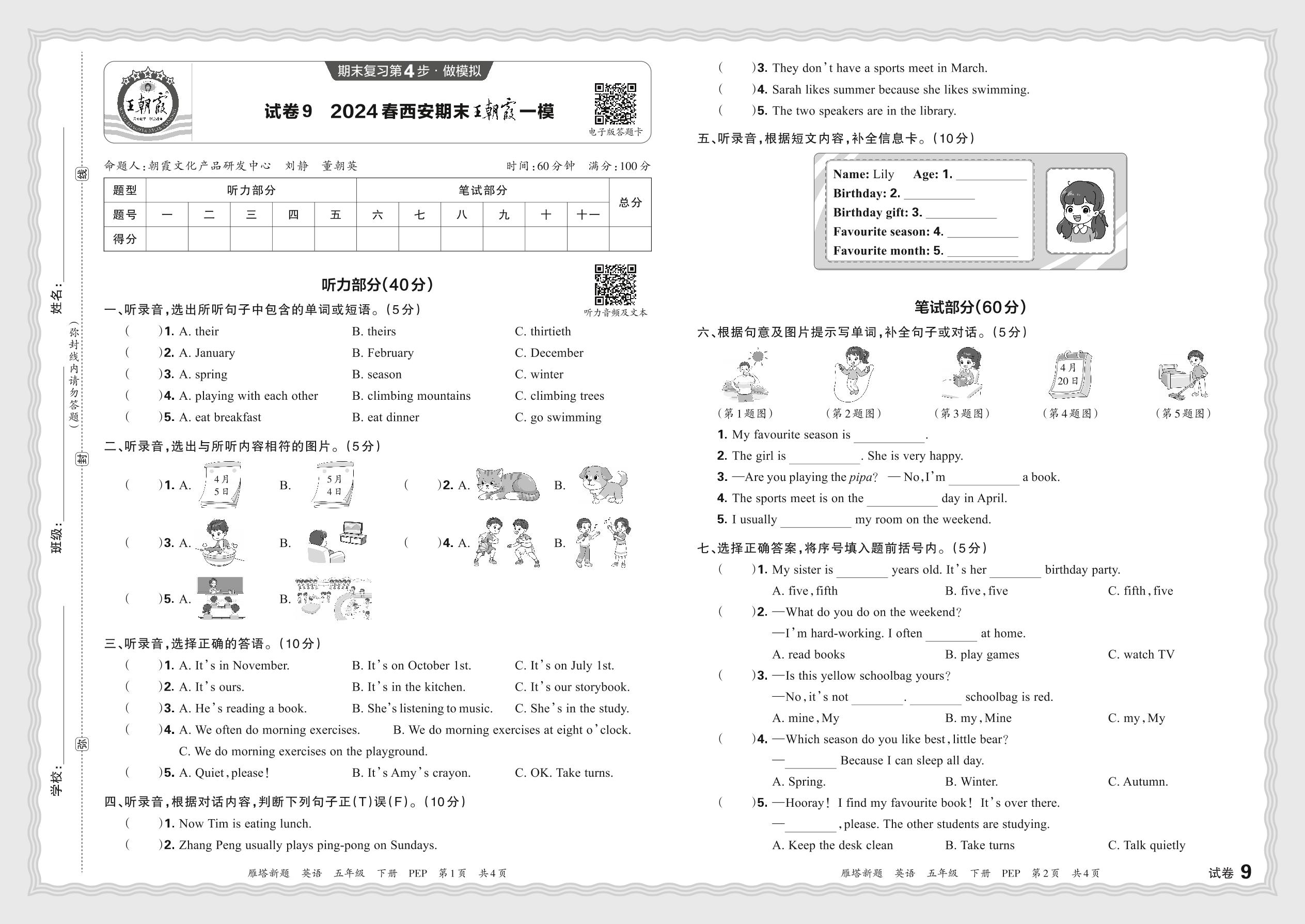 2024春下册五年级英语人教PEP版 陕西西安期末王朝霞一模