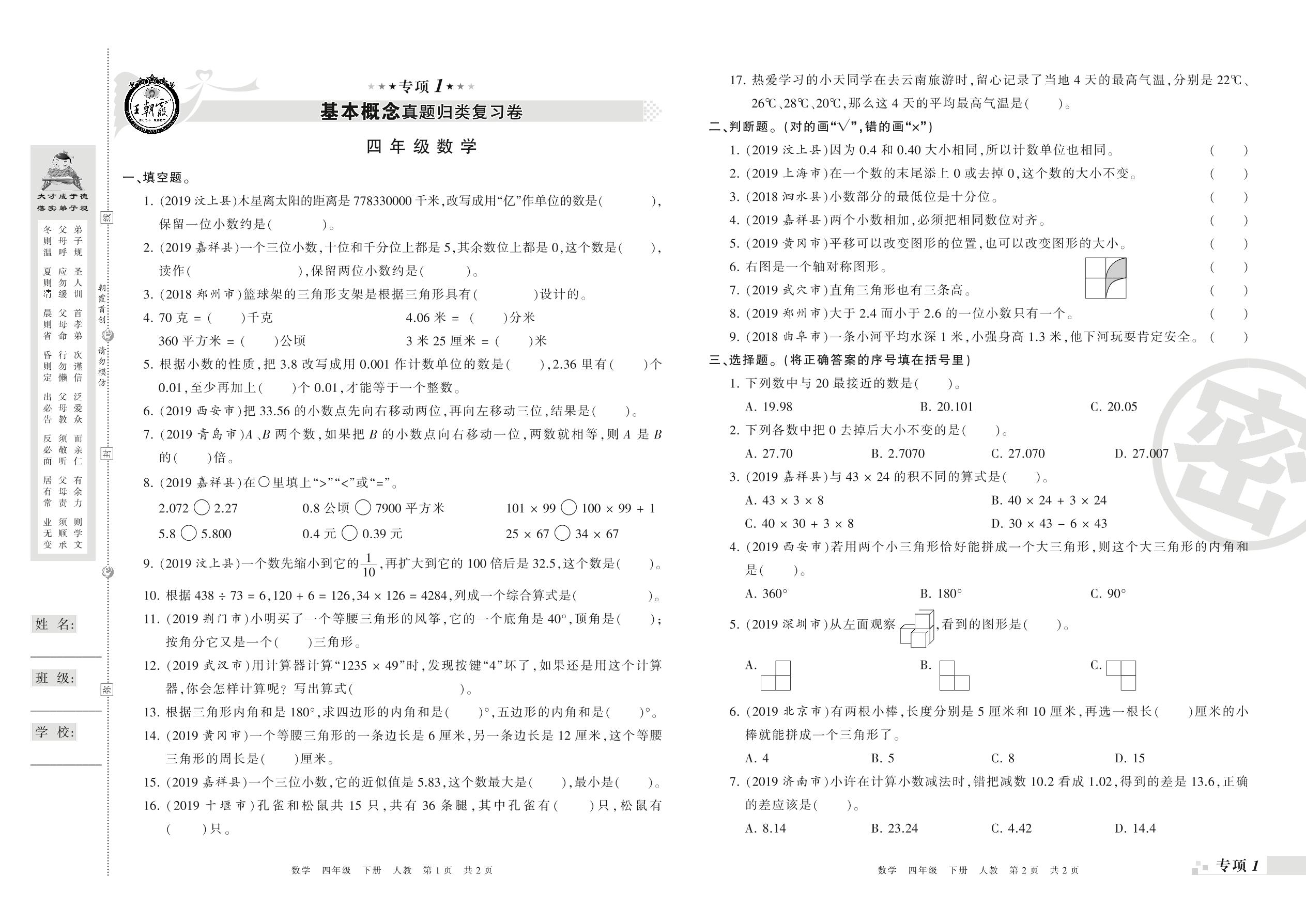 王朝霞期末专项卷——基本概念、计算真题归类复习卷四年级下册数学(人教版)_R210804142320【0】