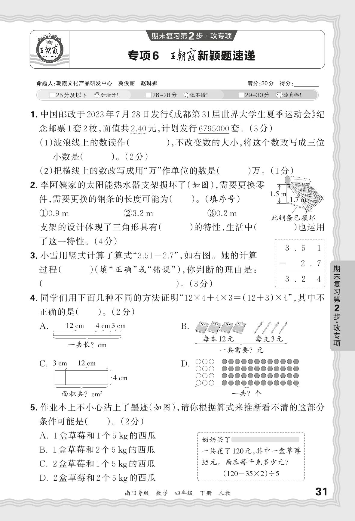 2024春下册四年级数学人教版 期末专项卷南阳版·王朝霞新颖题速递【6】