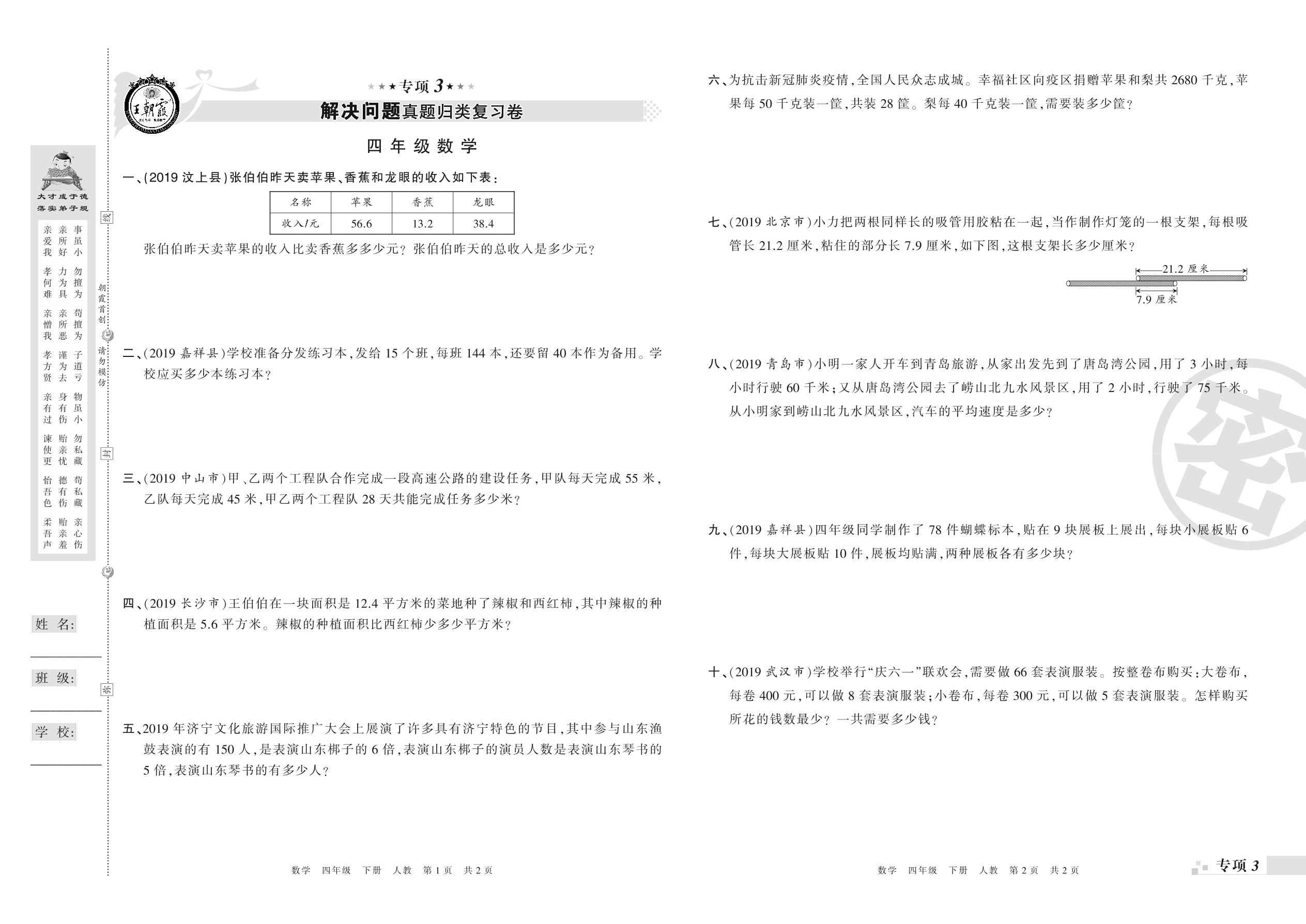 王朝霞期末专项卷——解决问题真题归类复习卷、新颖题速递:生活与数学四年级下册数学(人教版)_R210804142324【0】