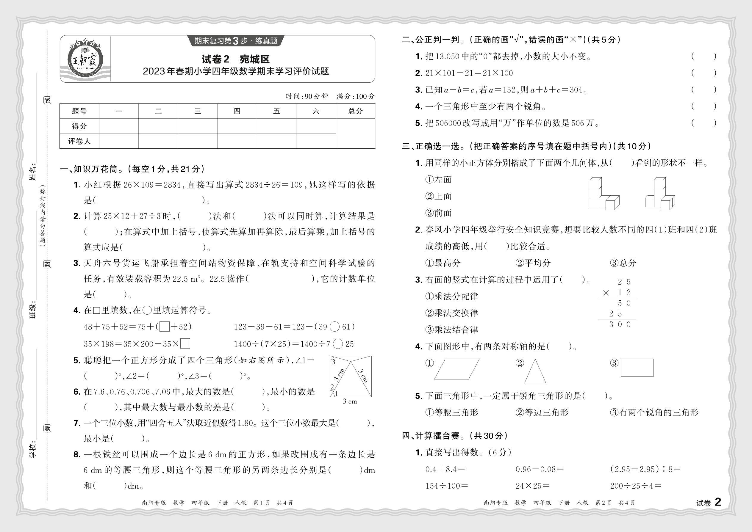 河南省南阳市宛城区2023年春期小学四年级数学期末学习评价试题(人教版)【2】