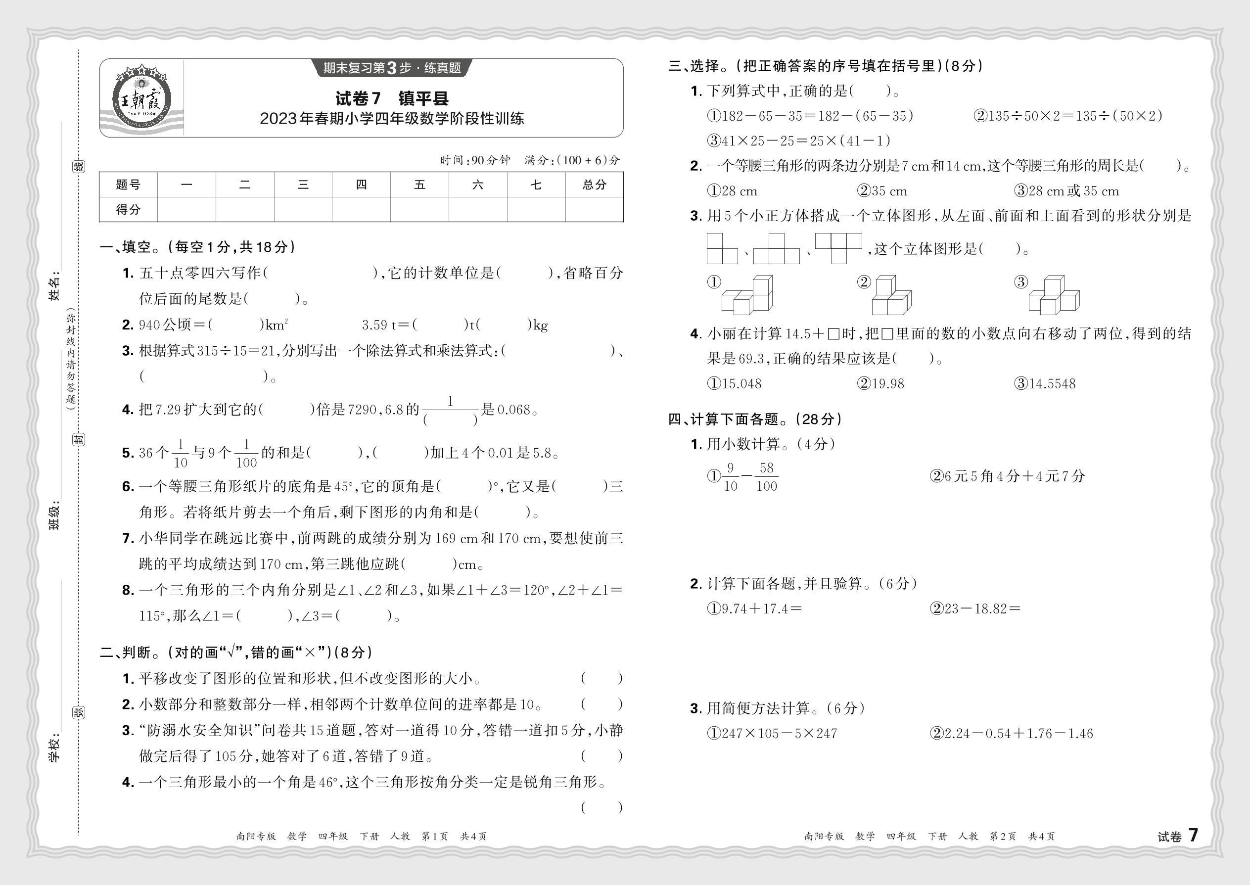 河南省南阳市镇平县2023年春期小学四年级数学阶段性训练(人教版)【7】
