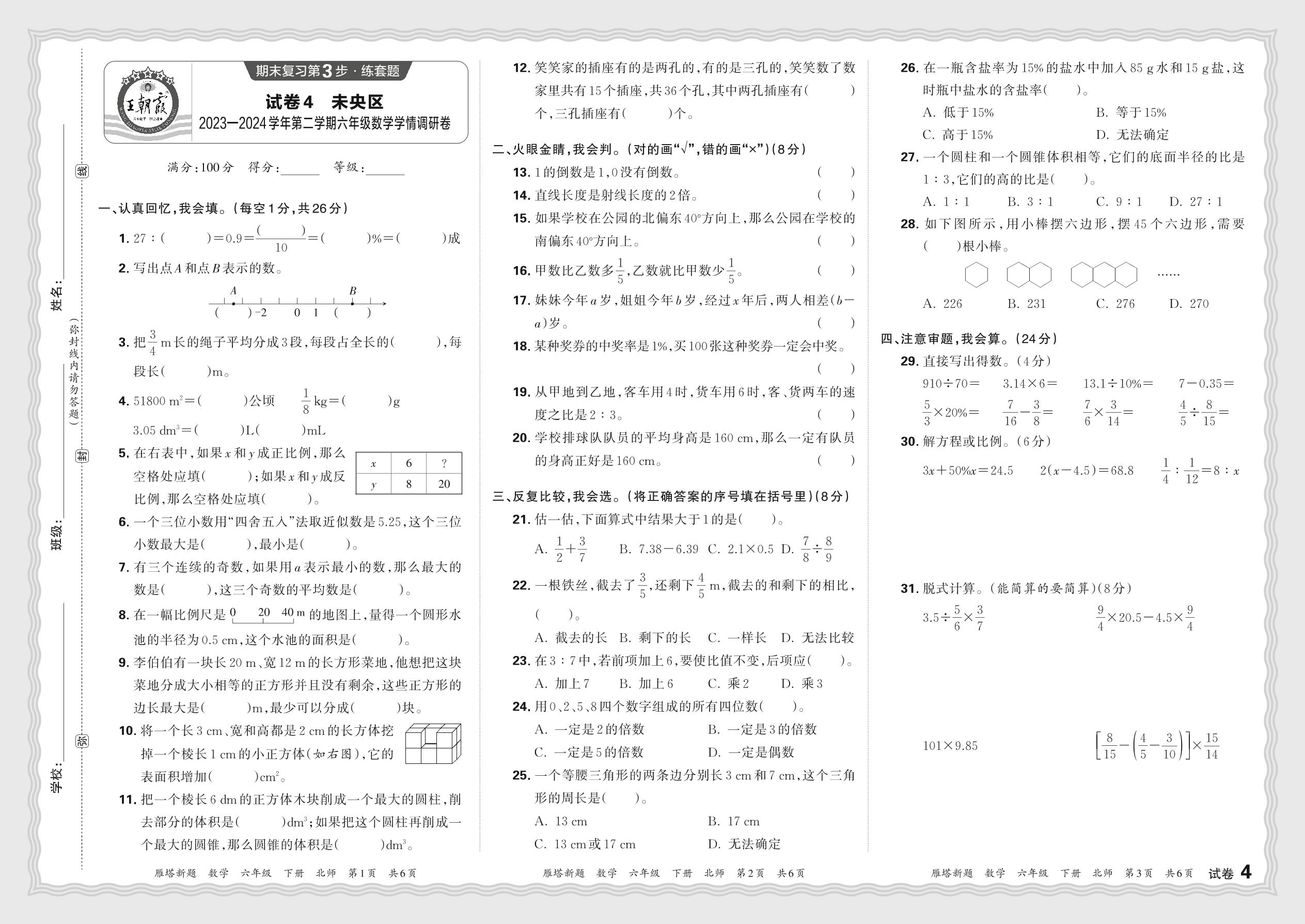 陕西省西安市未央区2023—2024学年第二学期六年级数学学情调研卷(北师版)【4】