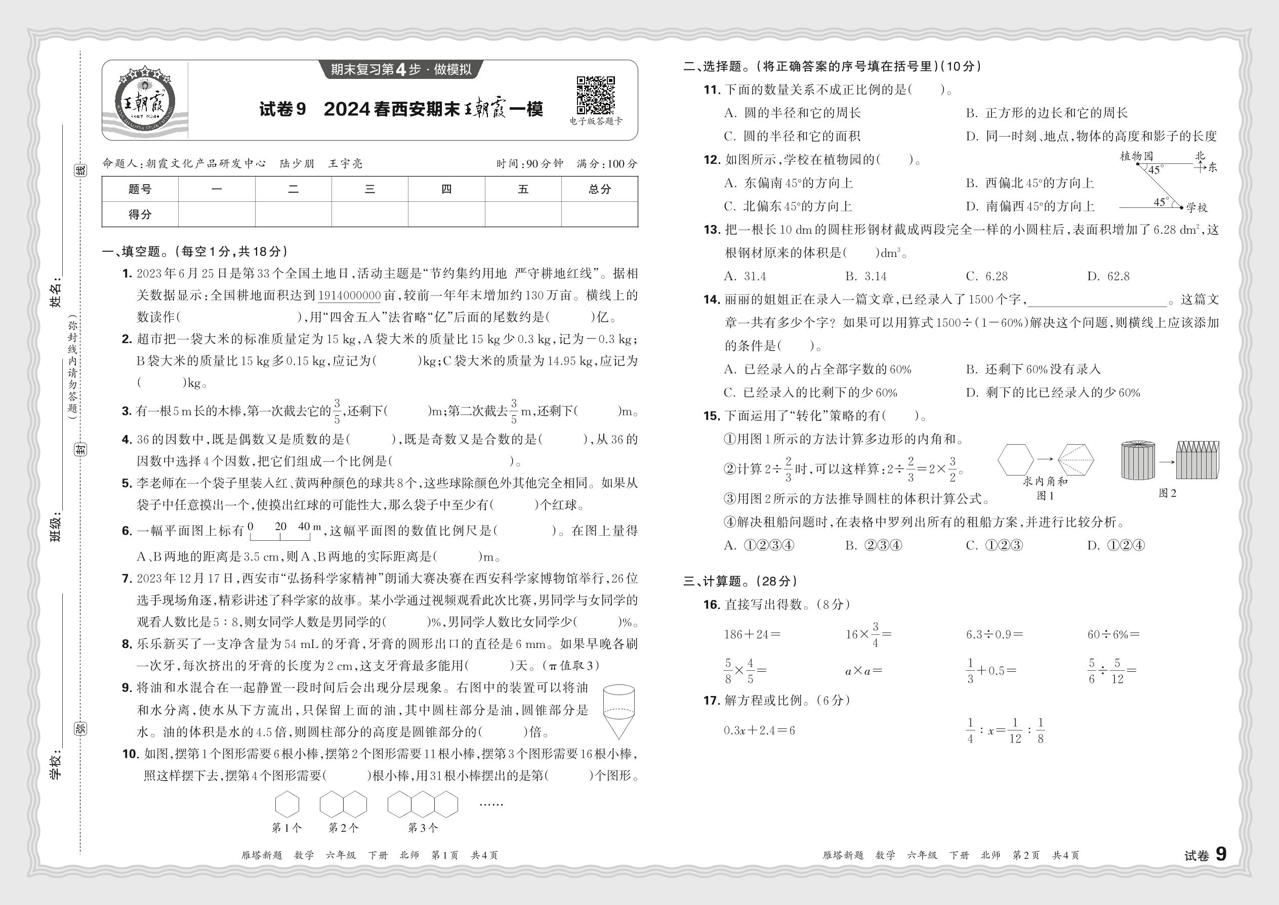 2024春下册六年级数学北师版 陕西西安期末王朝霞一模
