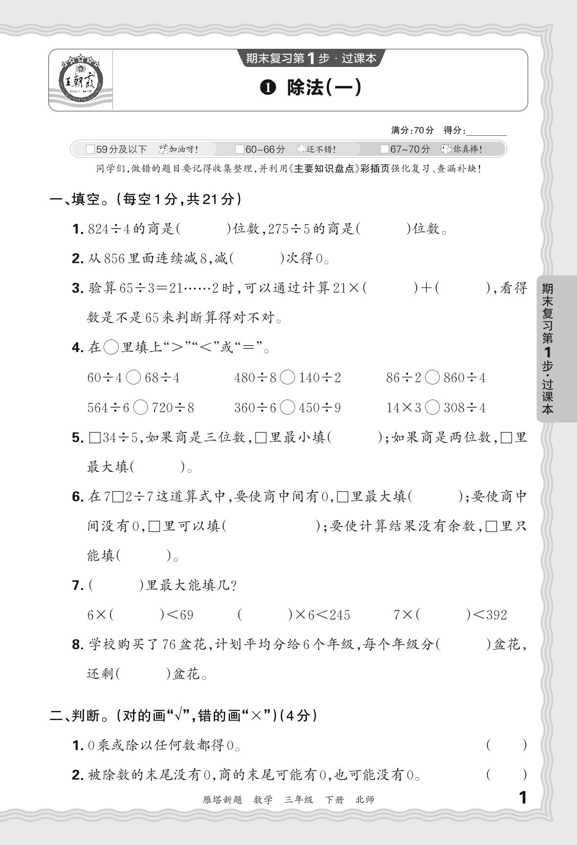 2024春下册三年级数学北师版 期末过课本西安版·除法(一)【1】