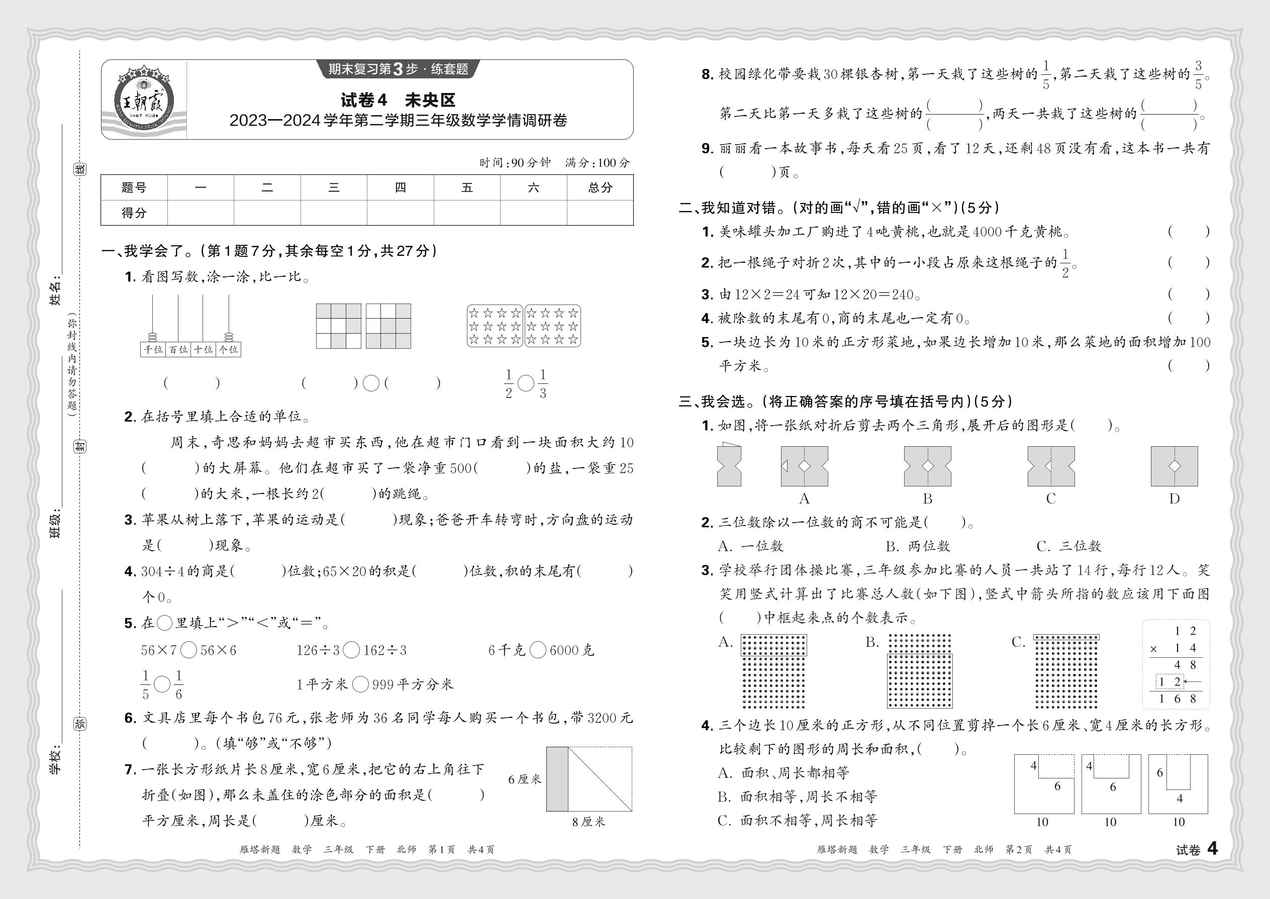三年级数学北师版下册期末卷