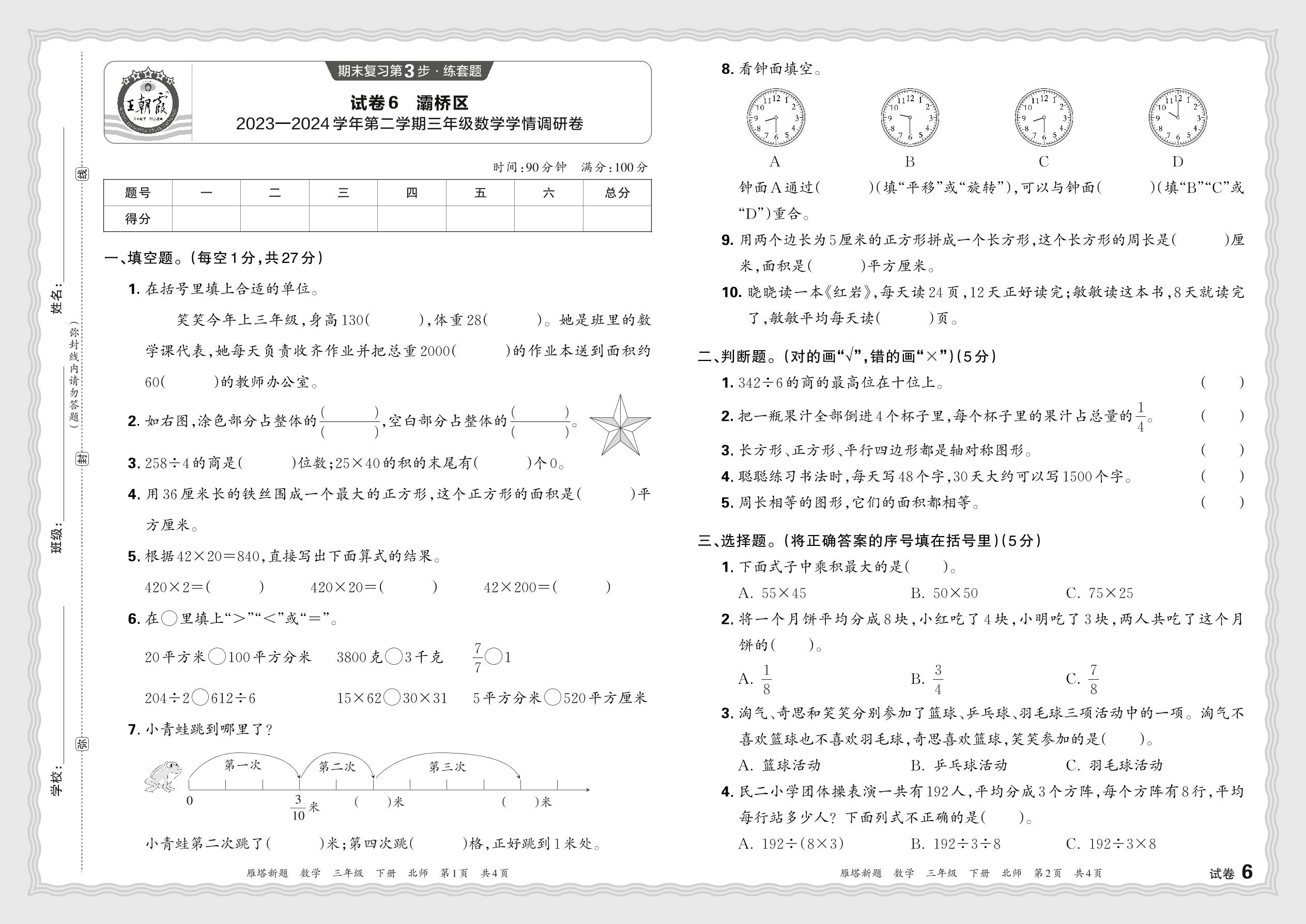 陕西省西安市灞桥区2023—2024学年第二学期三年级数学学情调研卷(北师版)【6】