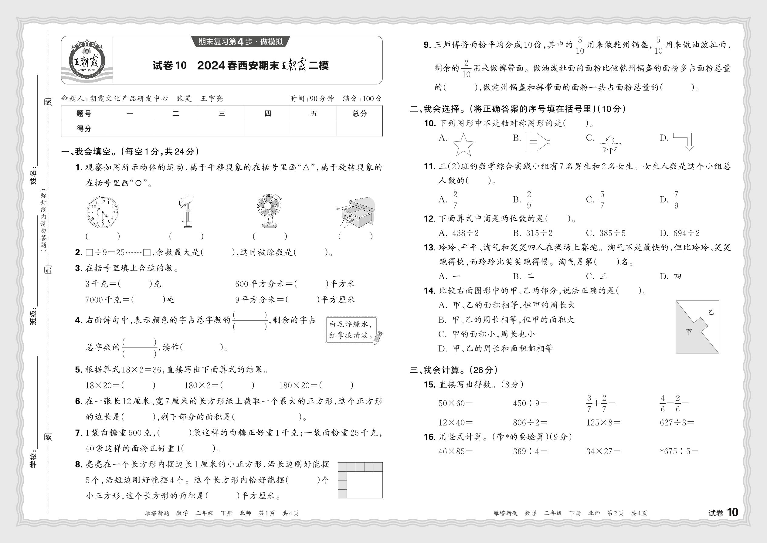 2024春下册三年级数学北师版 陕西西安期末王朝霞二模