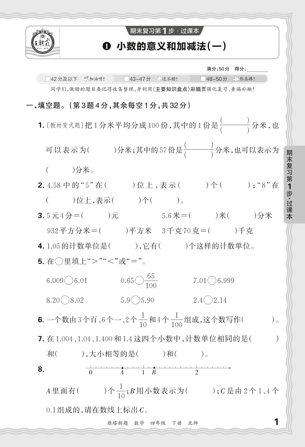 2024春下册四年级数学北师版 期末过课本西安版·小数的意义和加减法(一)【1】