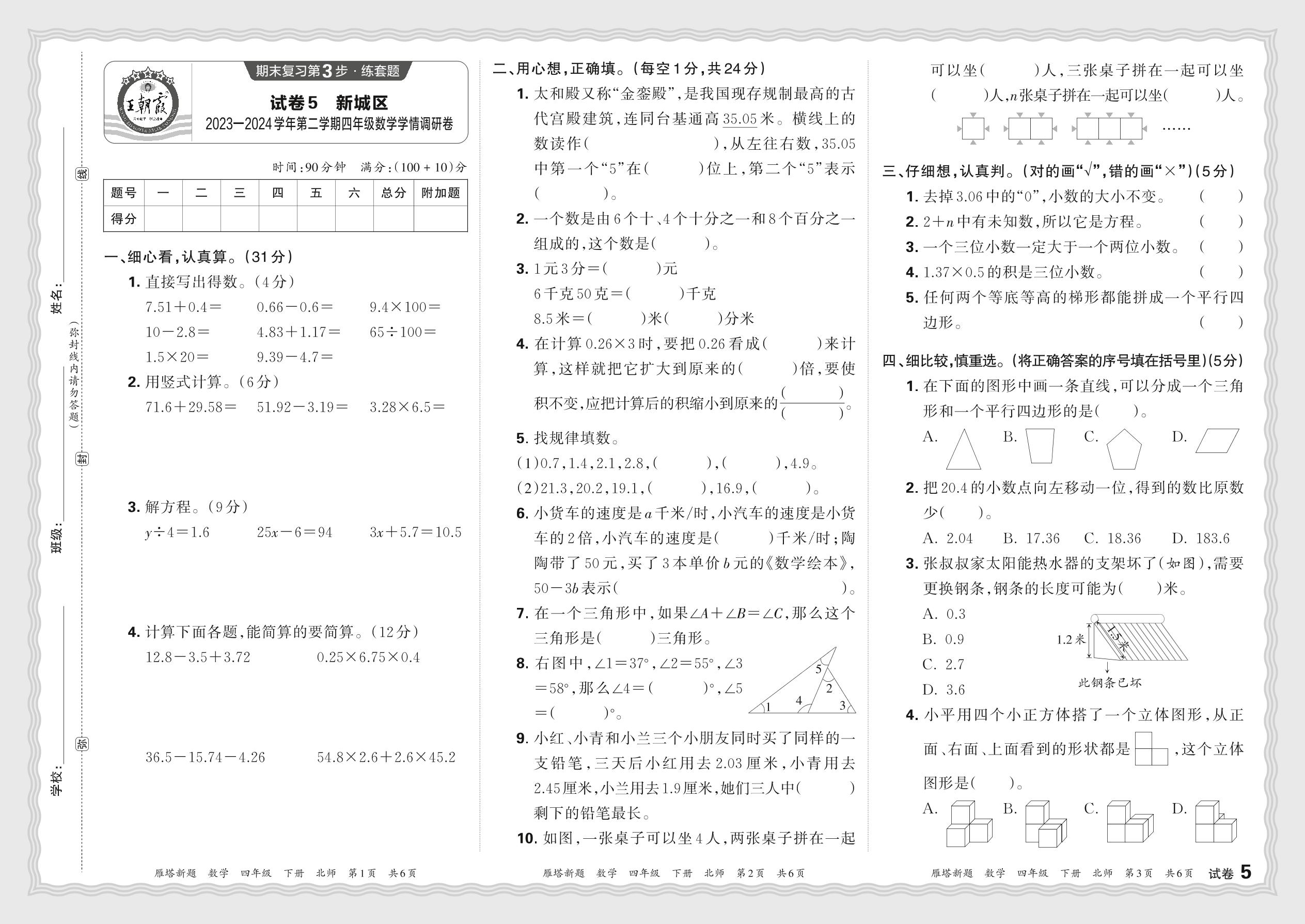 四年级数学北师版下册期末卷