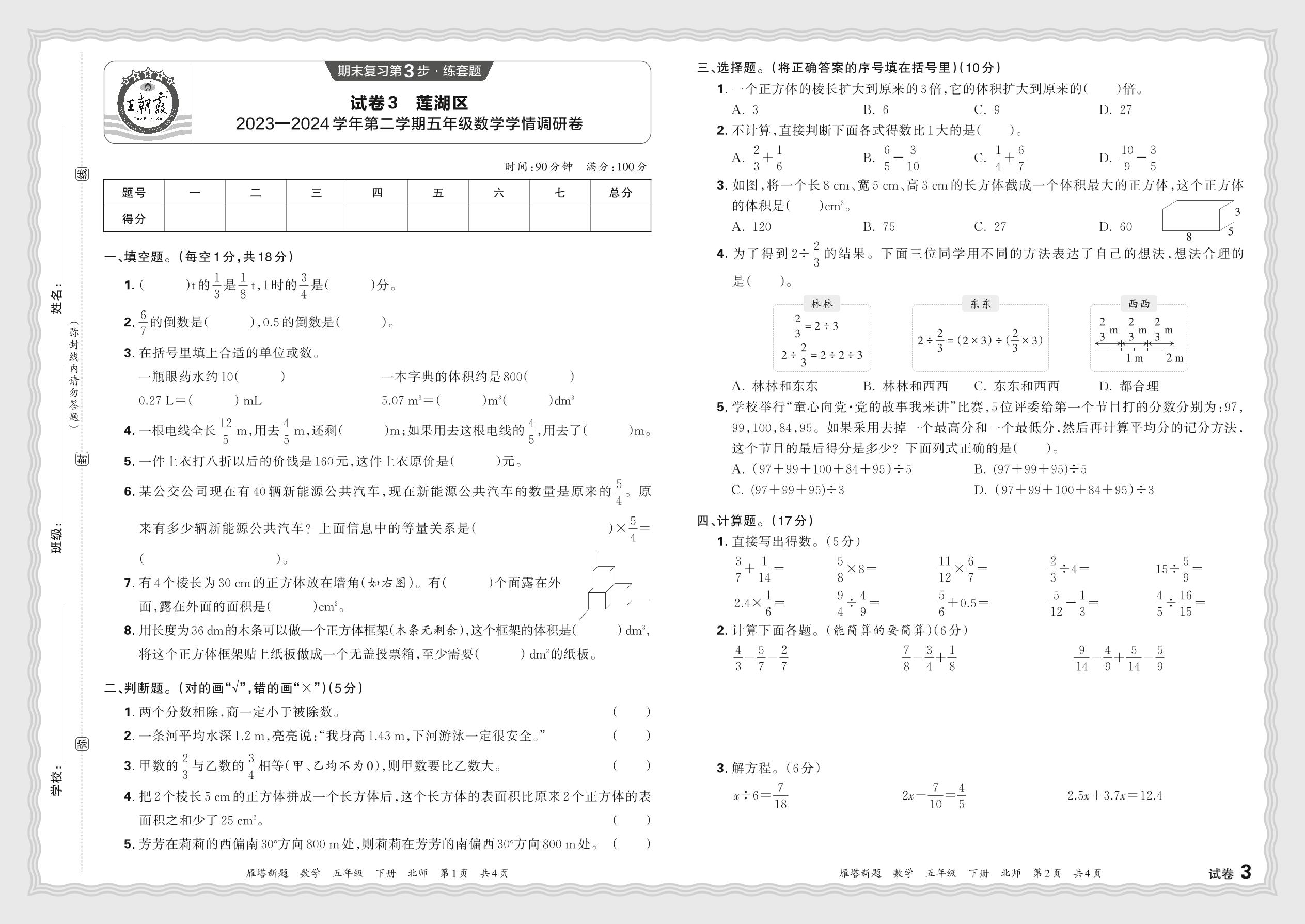 陕西省西安市莲湖区2023—2024学年第二学期五年级数学学情调研卷(北师版)【3】