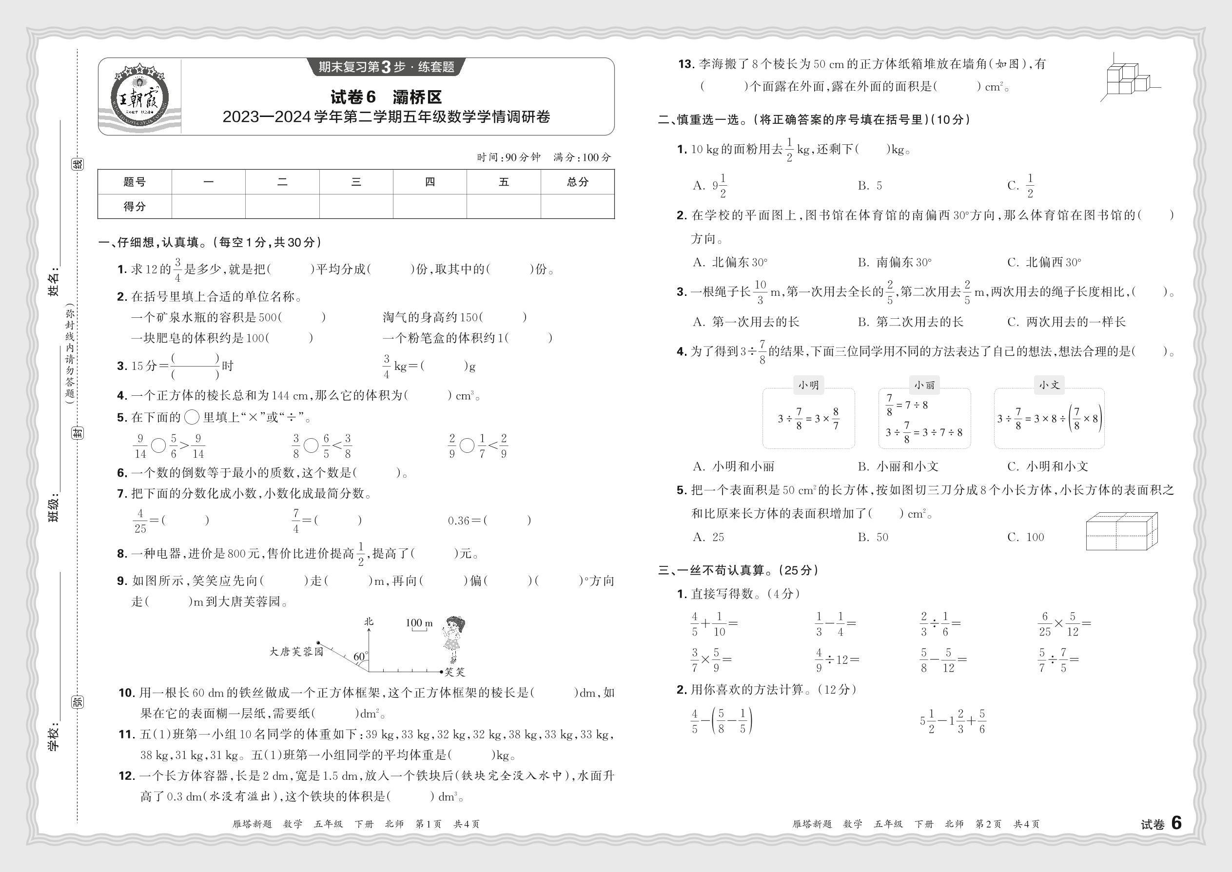 陕西省西安市灞桥区2023—2024学年第二学期五年级数学学情调研卷(北师版)【6】